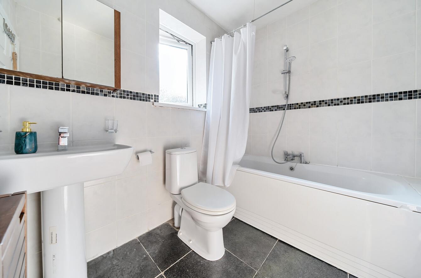 Bathroom: - Suite comprising bath with central mixer tap and shower attachment, wash basin, WC, tiled walls.