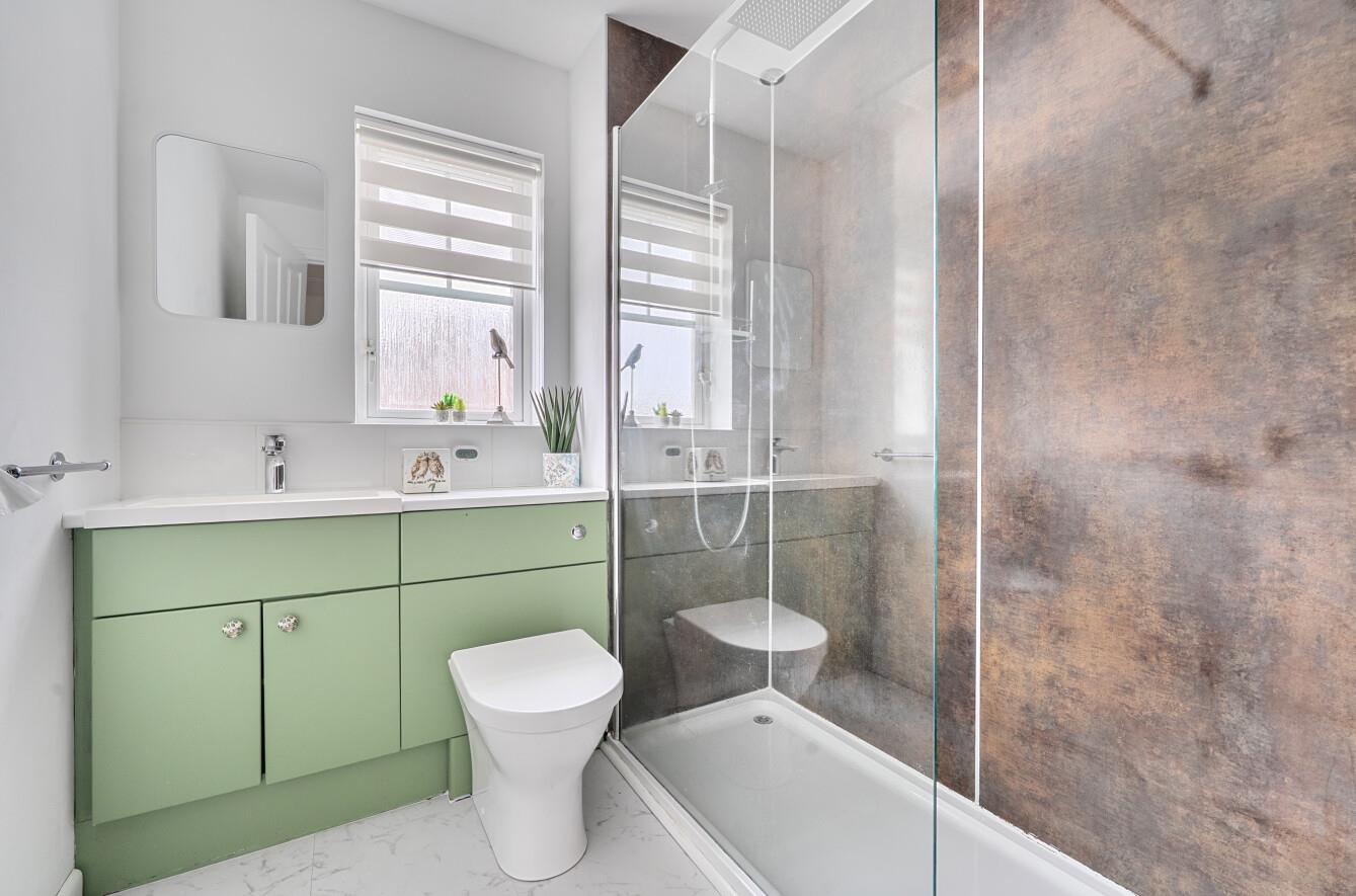 Shower Room: - Comprising open ended shower enclosure, wash hand basin and WC inset to vanity unit