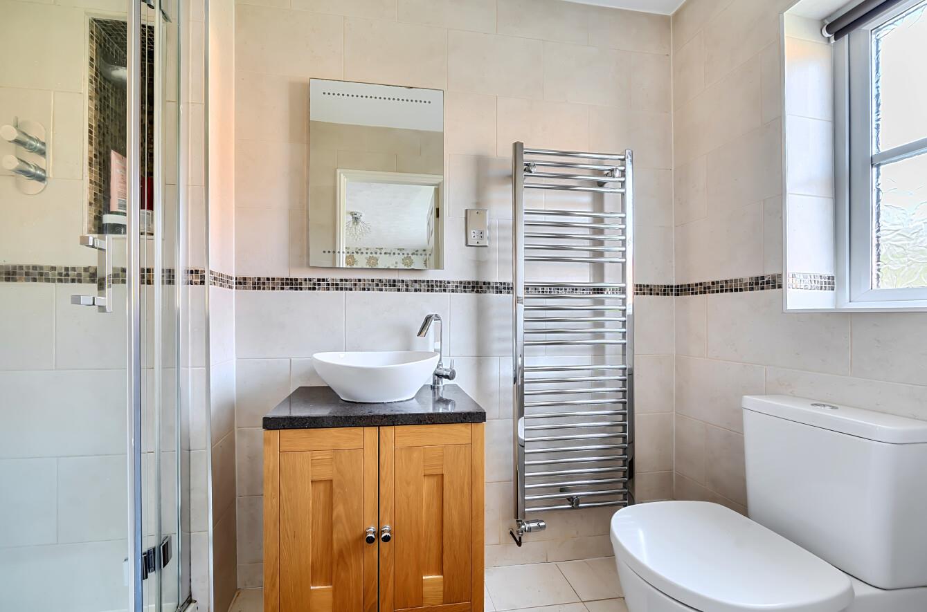 En-Suite: - Modern suite comprising: shower cubicle with folding glass screen, WC, wash basin with cupboard under.