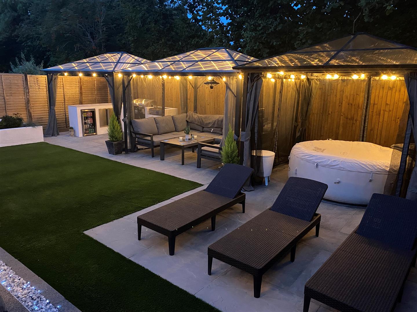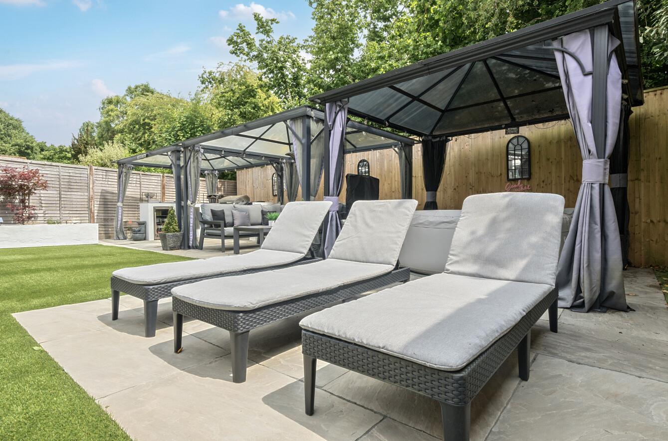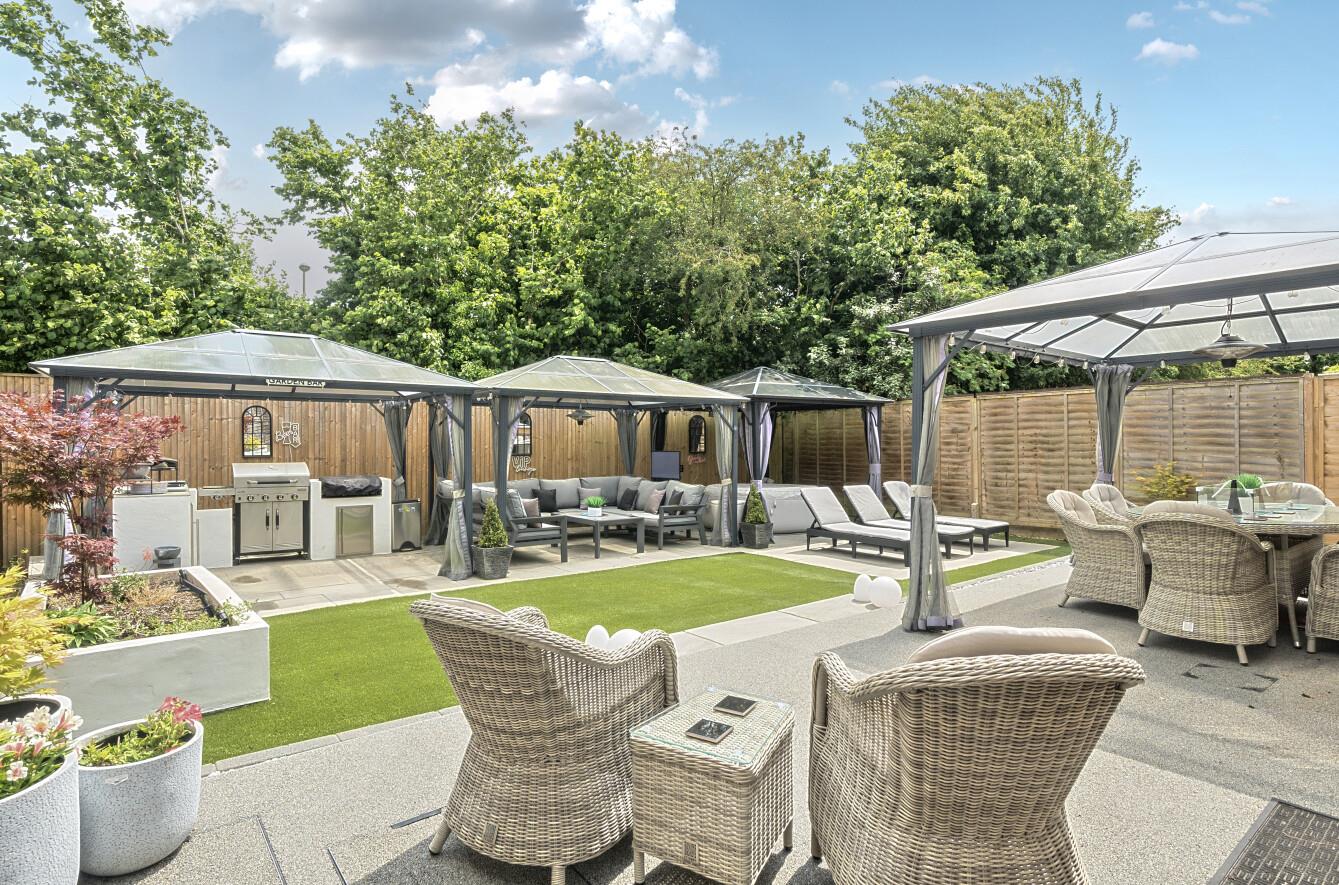 Rear Garden: - A particularly outstanding feature of the property which has been cleverly landscaped and designed with low maintenance and entertaining in mind. Adjoining the property is a full width resin bonded area leading on to an area of artificial grass which leads on to a full width paved area at the end of the garden providing space for table and chairs and sofas, three gazebos with lighting and an outdoor kitchen with built in barbeque, drinks fridge and storage. The gardens provide outside power and are enclosed by fencing.