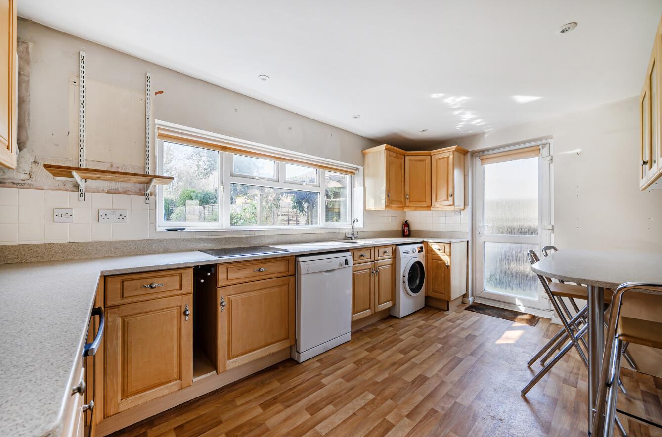 Kitchen/Breakfast Room: - 14'2" x 8'10" (4.33m x 2.69m) Range of units, electric oven, induction hob, space and plumbing for appliances, breakfast bar, boiler, composite worktops, door to outside.