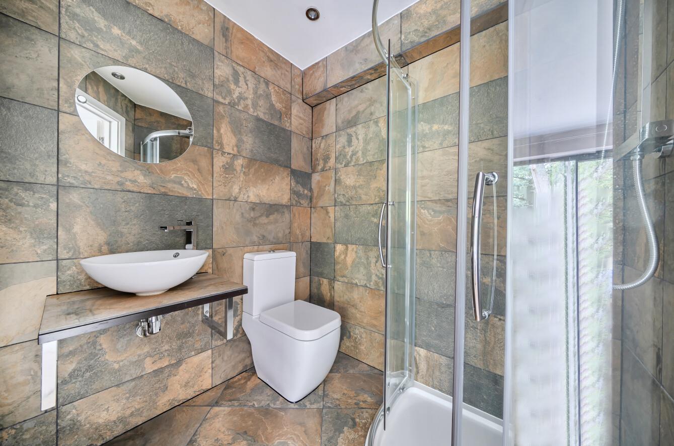 En-Suite: - Modern white suite with chrome fitments comprising corner shower cubicle with glazed screen, circular wash basin, tiled walls and floor.