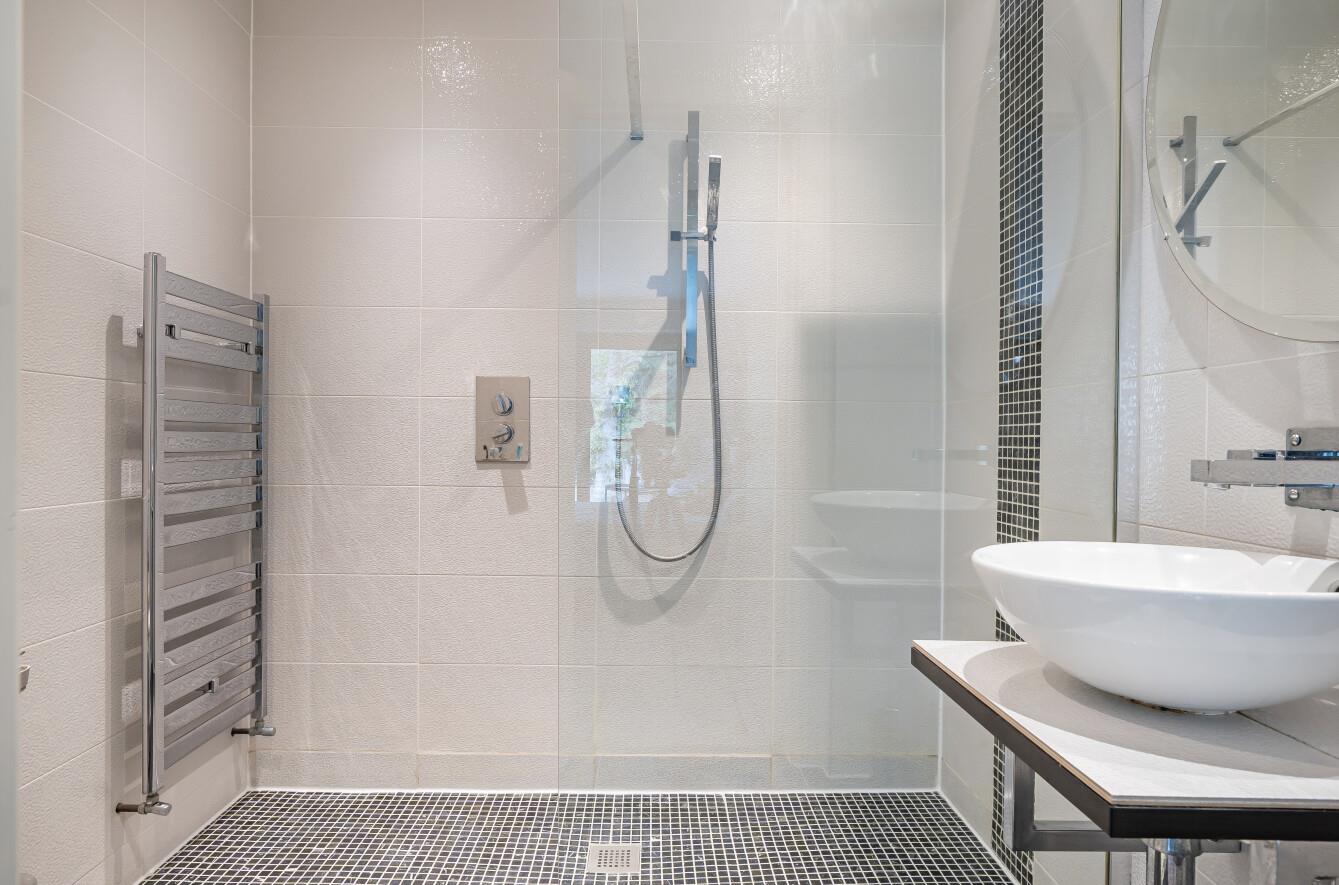 En-Suite: - Modern white suite in a wet room style with spacious walk in shower with glazed screen, circular wash basin, wc, tiled walls and floor.