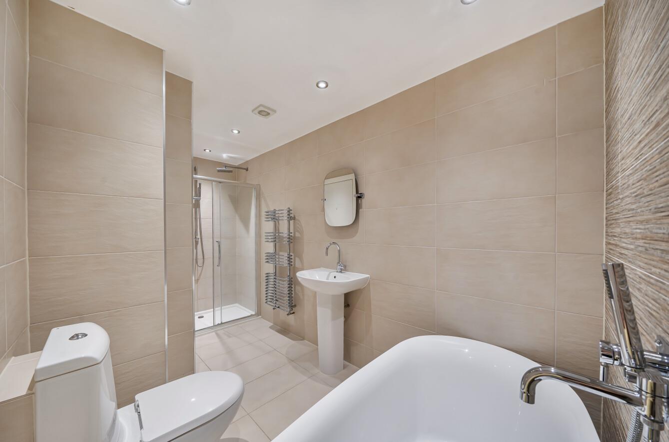 Bathroom: - A beautifully appointed modern white suite featuring a deep double ended bath, double width shower cubicle with glazed screen, wash basin, wc, tiled floor.