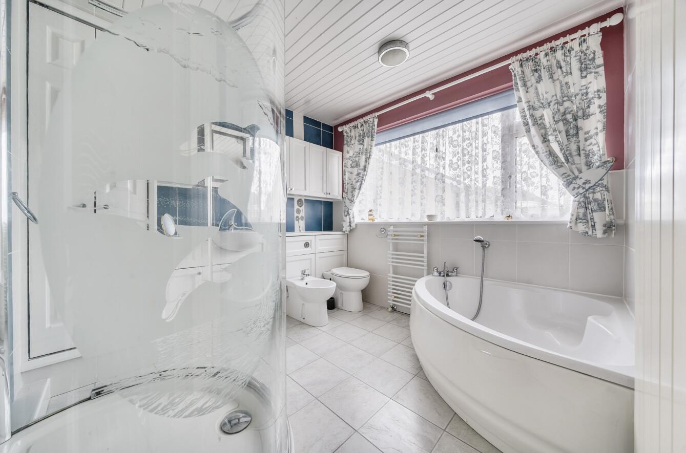 Bathroom: - Suite comprising corner bath, separate shower cubicle, wash basin, WC, bidet, storage cupboards, boiler cupboard.