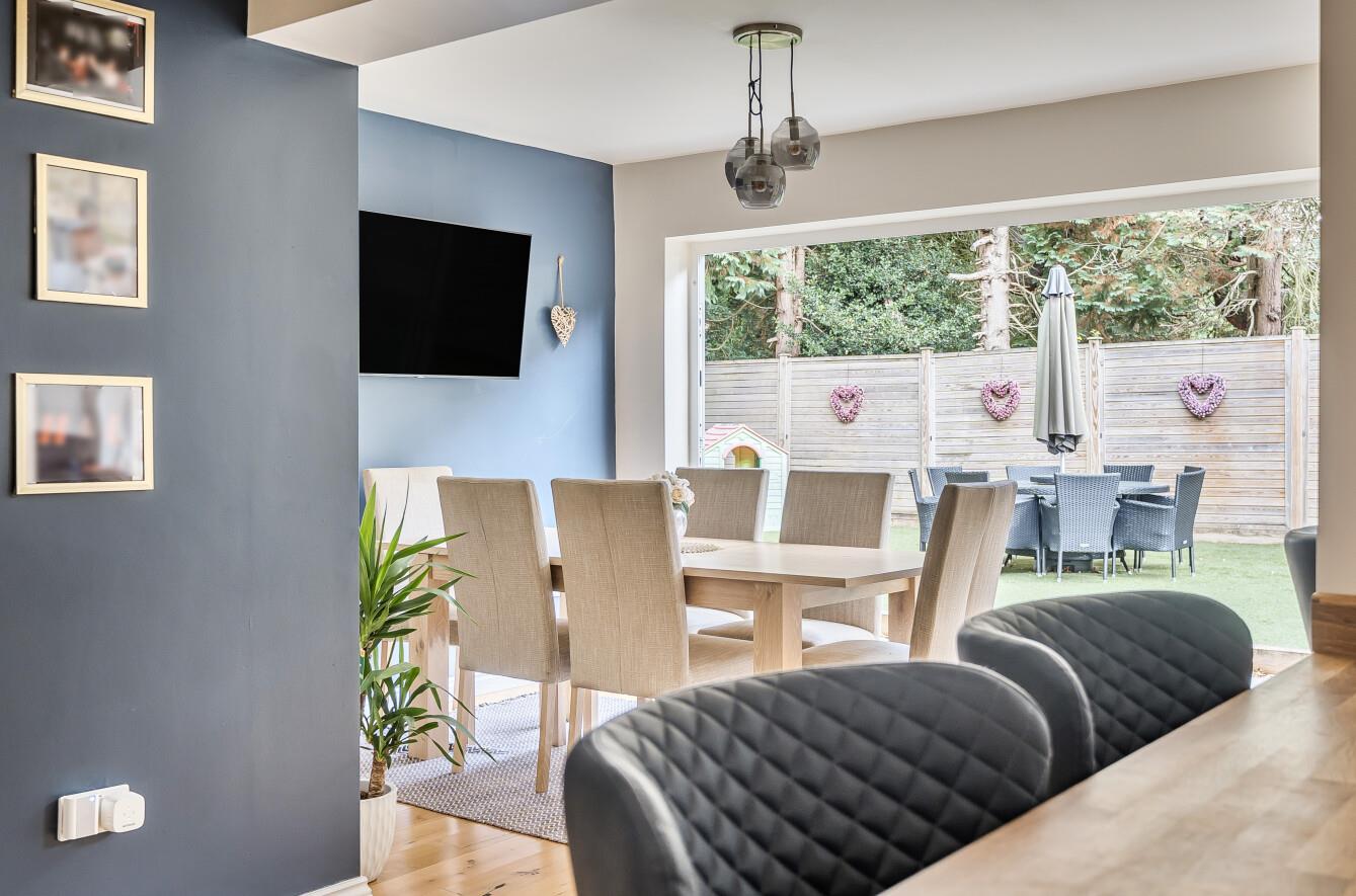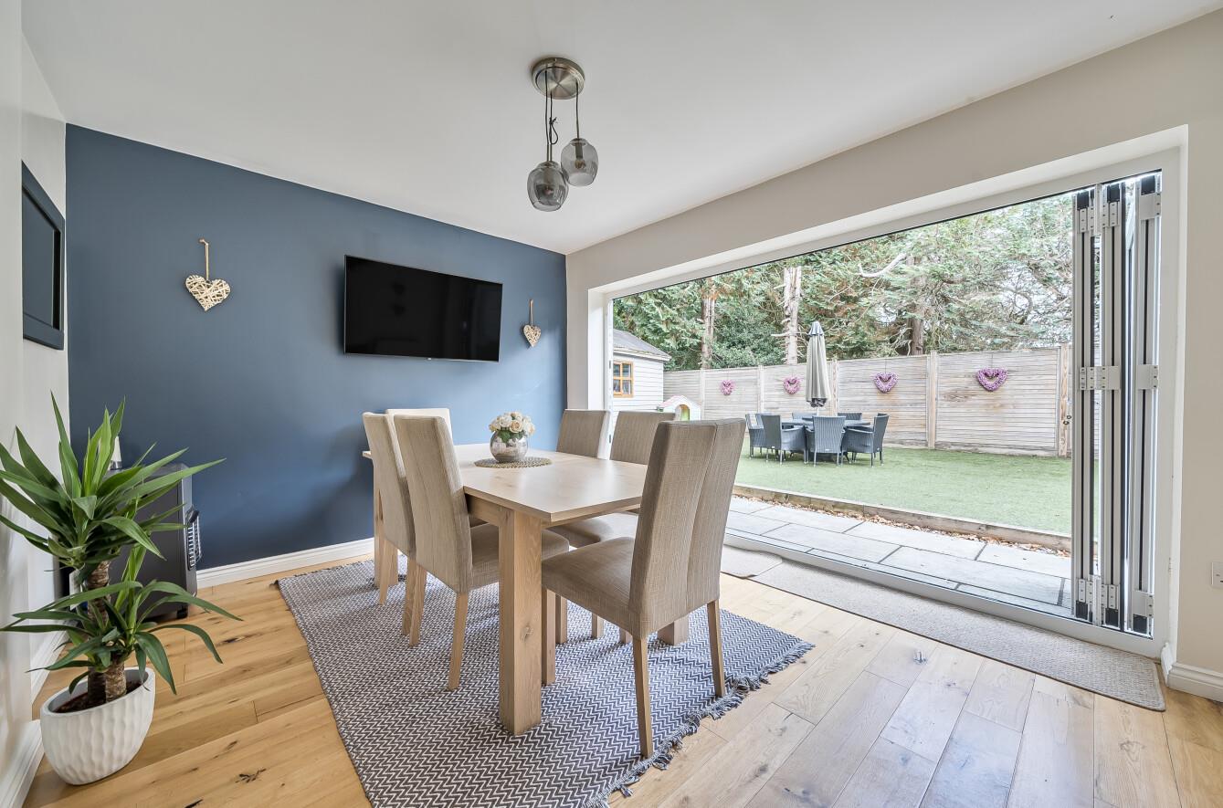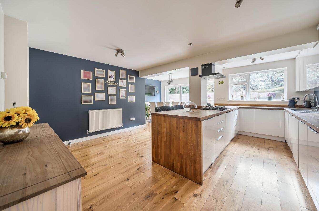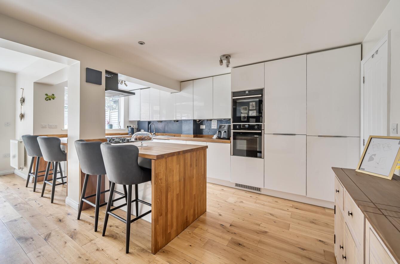 Kitchen/Dining Room: - 21'10" x 21'3" (6.65m x 6.48m) Oak flooring throughout. The kitchen area has been fitted with a comprehensive range of white gloss units and wooden work tops incorporating breakfast bar, stainless steel double two electric ovens and gas hob with extractor hood over, integrated dishwasher, full height fridge and freezer, under stairs cupboard with space and plumbing for washing machine and tiled floor. The dining/sitting area has space for table and chairs, bi-fold doors to rear garden.