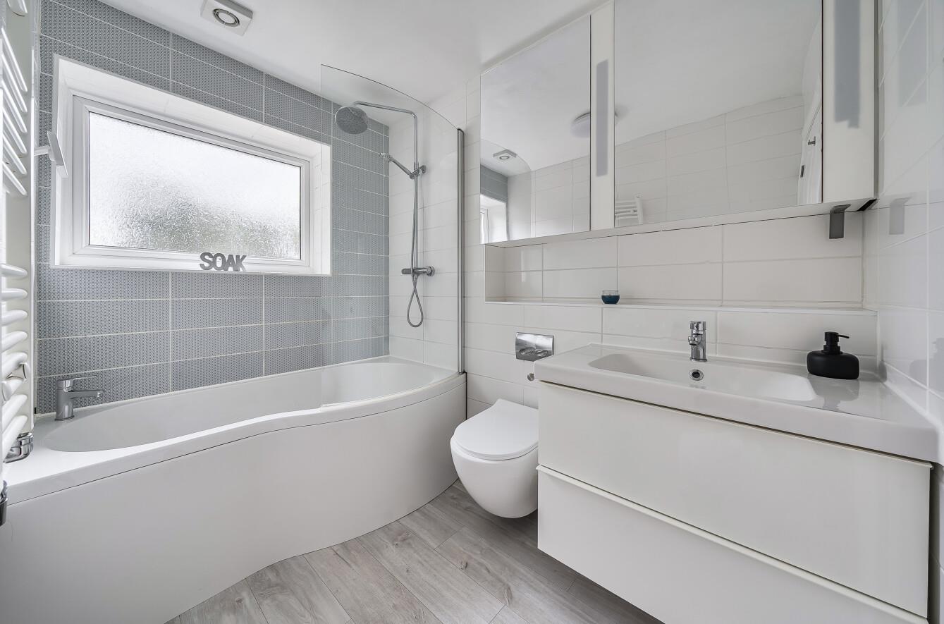 Bathroom: - 7'9" x 5'5" (2.36m x 1.65m) Re-fitted modern white suite with chrome fitments comprising P shaped bath with shower unit over and glazed screen, wash basin with cupboards under, w.c., tiled walls.