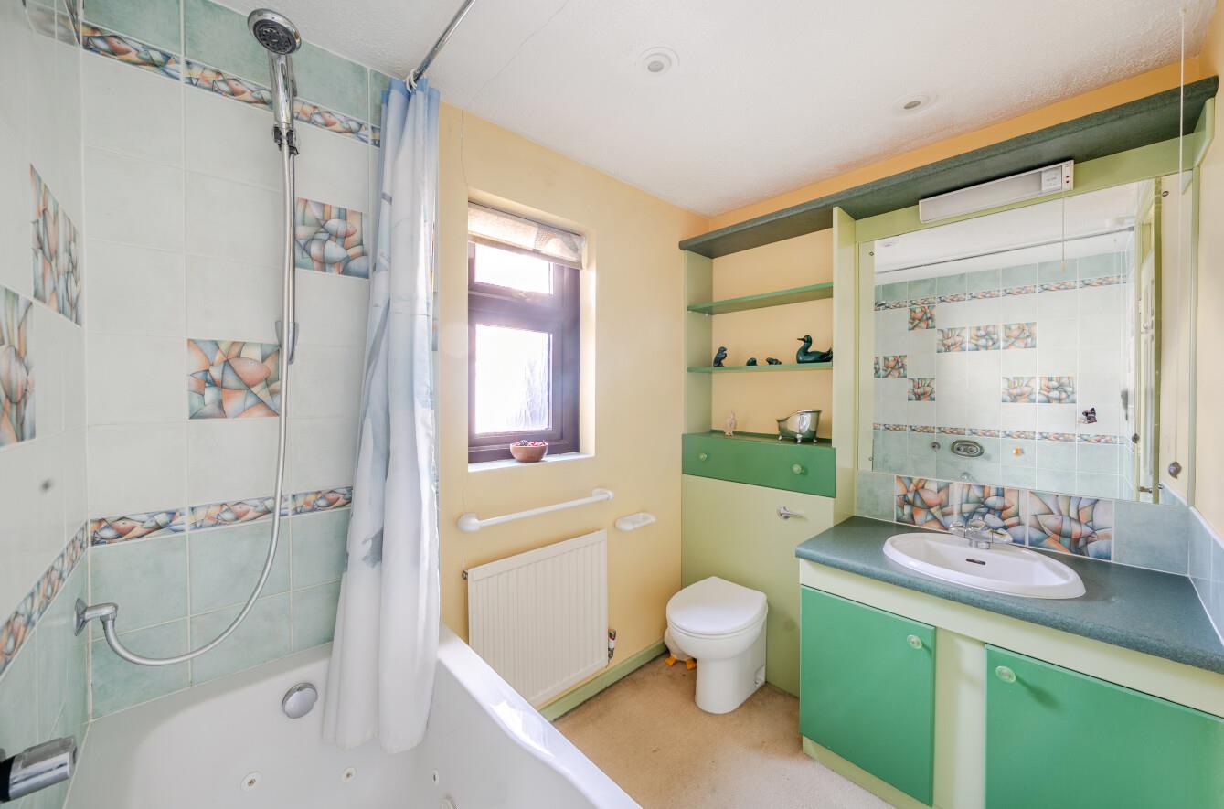 Bathroom: - Comprising hydrotherapy bath with shower over, wash hand basin with cupboards under, WC.