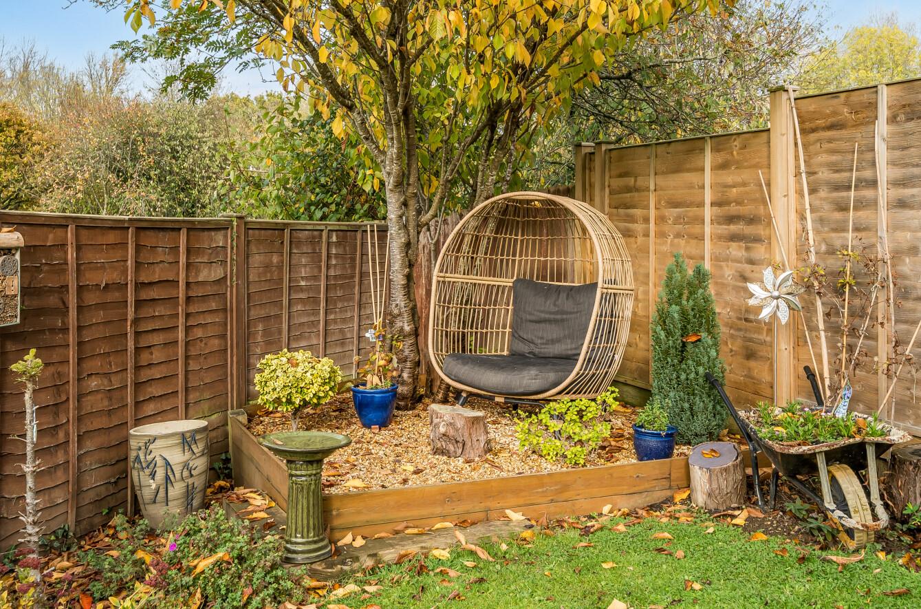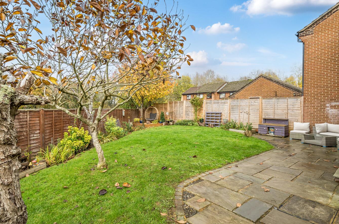 Rear Garden: - A particularly attractive feature of the property and of triangular shape with a full width patio ideal for outside entertaining leading on to a good sized lawned area, surrounded by well stocked borders and enclosed by fencing.