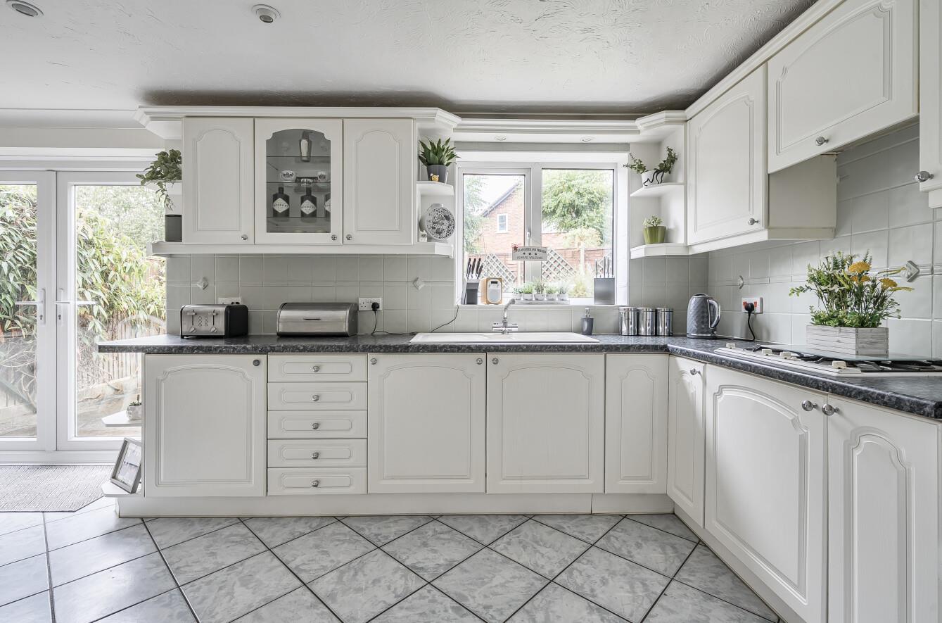 Kitchen/Diner: - 20'2" x 10'10" (6.15m x 3.30m) Range of white units, sink, built in fridge/freezer, gas hob with extractor hood over, and electric oven.