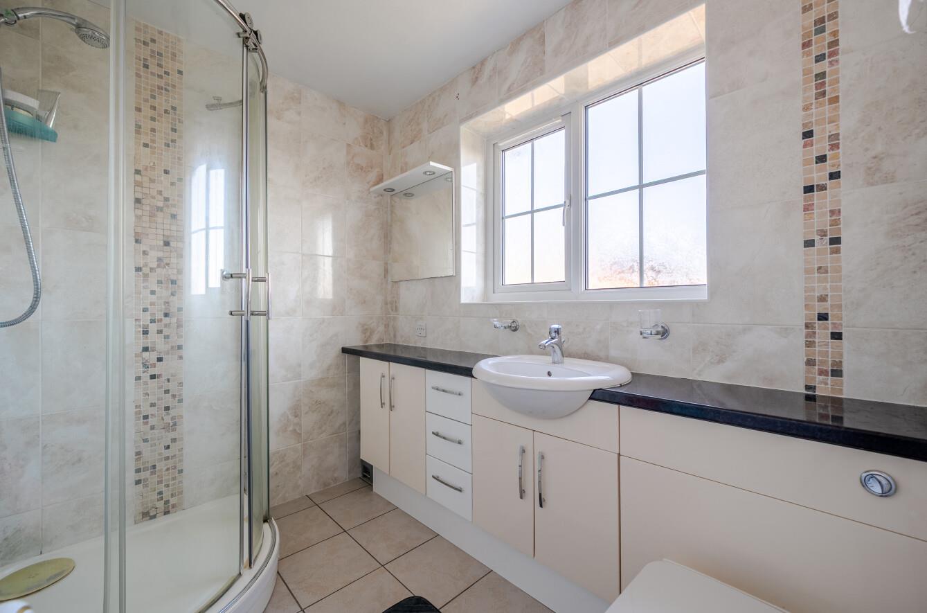 En Suite: - Comprising shower in cubicle, wash hand basin and WC inset to vanity unit, tiled walls, tiled floor.