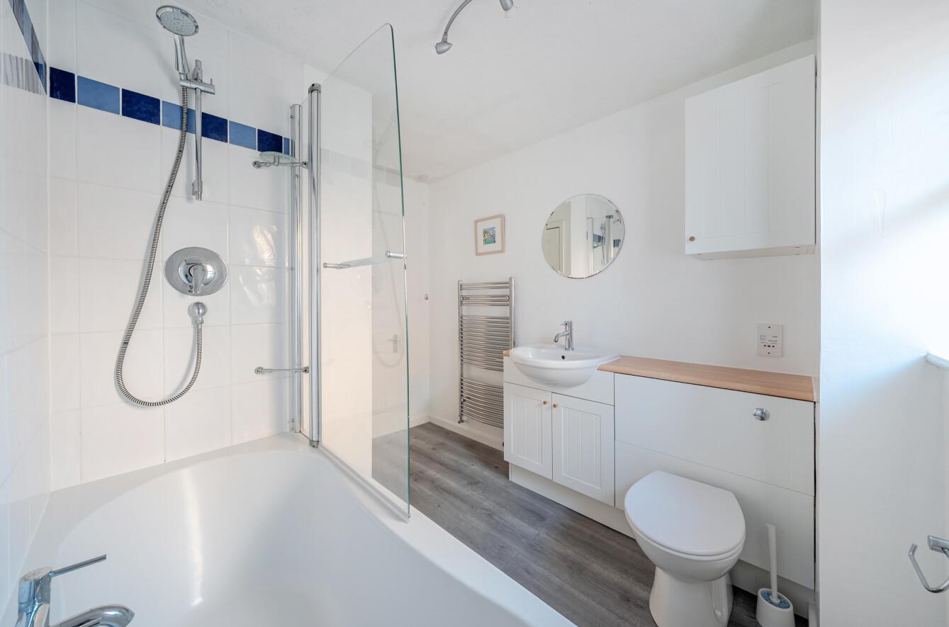 Bathroom: - Suite comprising bath with mixer tap, separate shower unit over and glazed screen, wash basin with cupboard under, WC. airing cupboard.