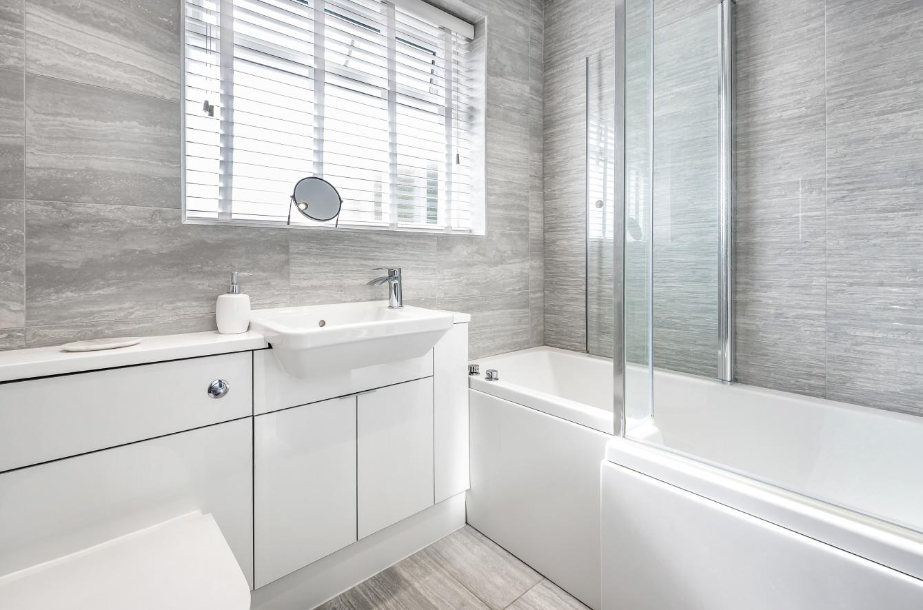 Bathroom: - 6'11" x 5'6" (2.11 x 1.68) Re-fitted modern white suite with chrome fitments comprising P shaped bath with mixer taps and separate shower unit over, wash basin, wc, tiled walls and floor.