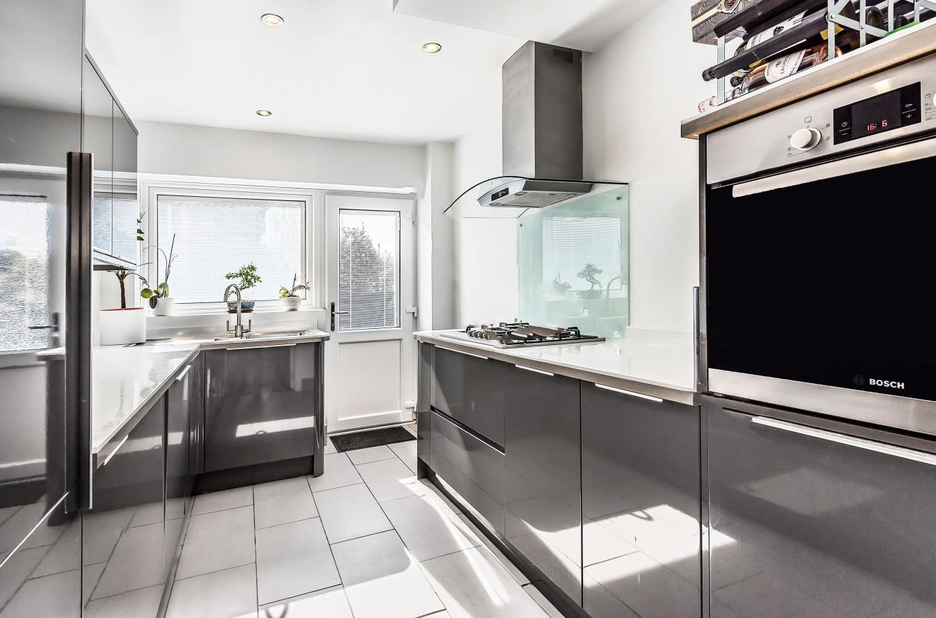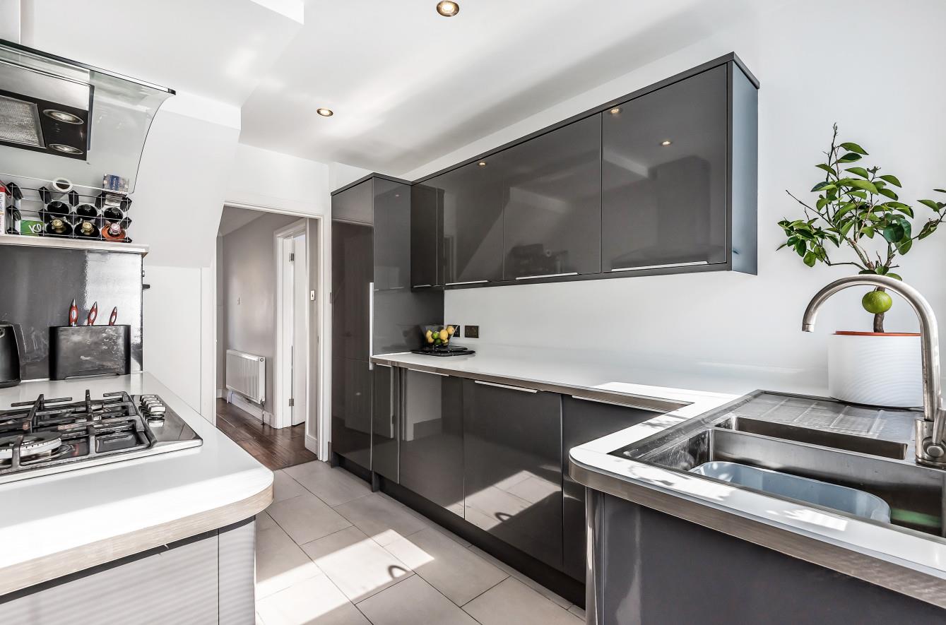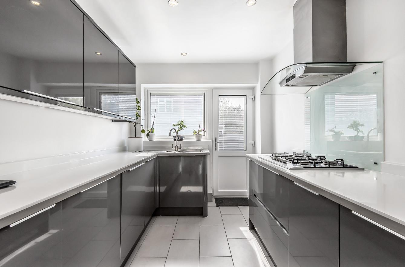 Kitchen: - 11'3" x 7'10" (3.43 x 2.39) Re-fitted range of modern grey gloss units, electric oven and gas hob with extractor hood over, integrated dishwasher, washing machine and fridge, tiled floor, door to rear garden.