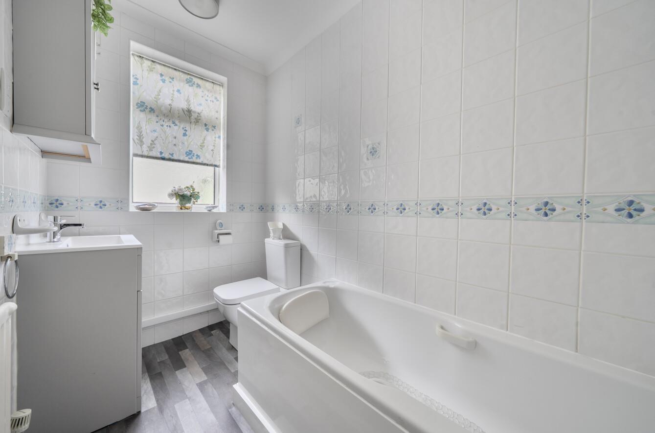 Bathroom: - Suite comprising bath with mixer tap, separate shower unit over and glazed screen, wash basin with cupboard under, WC, tiled walls.