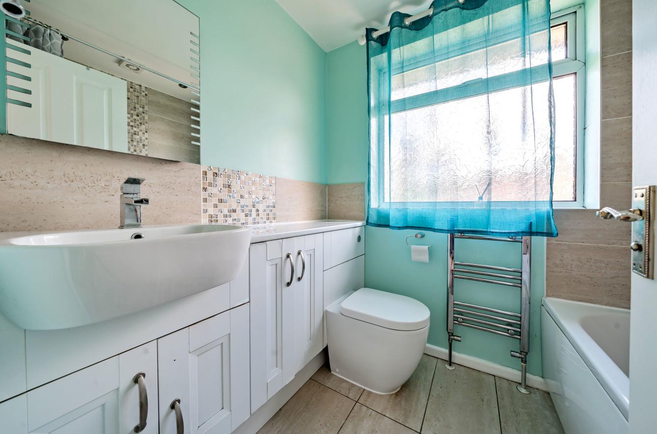 Bathroom: - 6'10" x 5'6" (2.08m x 1.68m) White suite with chrome fitments comprising panel bath with mixer tap, separate shower unit over, wash basin with cupboard under, wc, tiled floor.