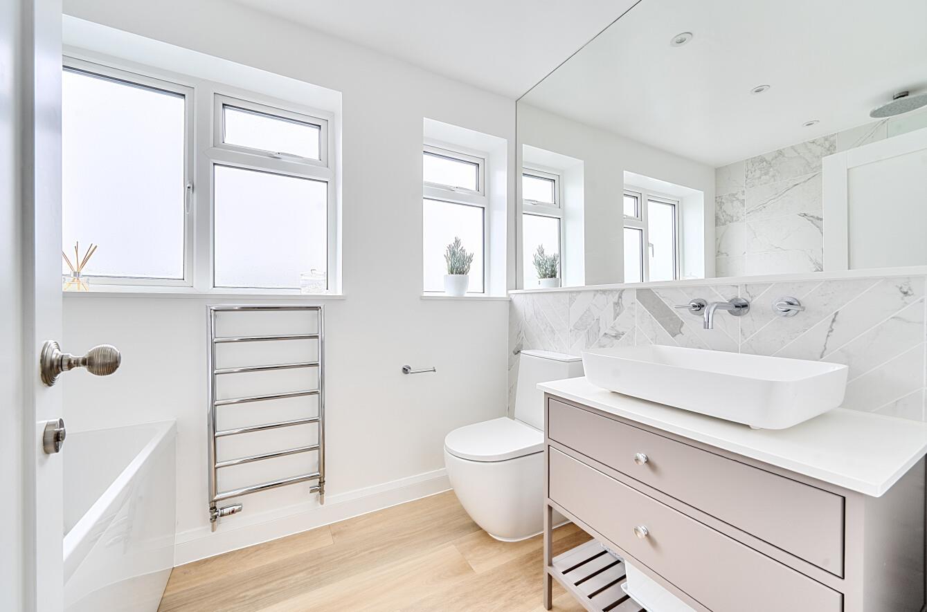 Bathroom: - Re-fitted modern white suite comprising bath with central mixer tap and shower unit, wash basin with cupboard under, WC, underfloor heating.