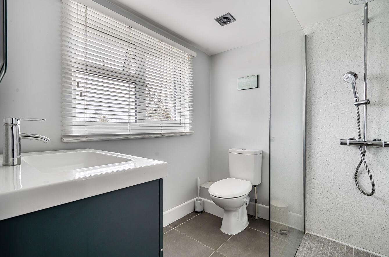 En-Suite: - Suite comprising walk in shower area with glazed screen, wash basin with cupboard under, WC, tiled floor.