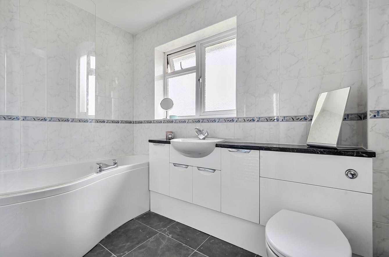 Bathroom: - Suite comprising P shaped bath with shower unit over and glazed screen, sink unit with cupboard under, WC, tiled walls and floor.