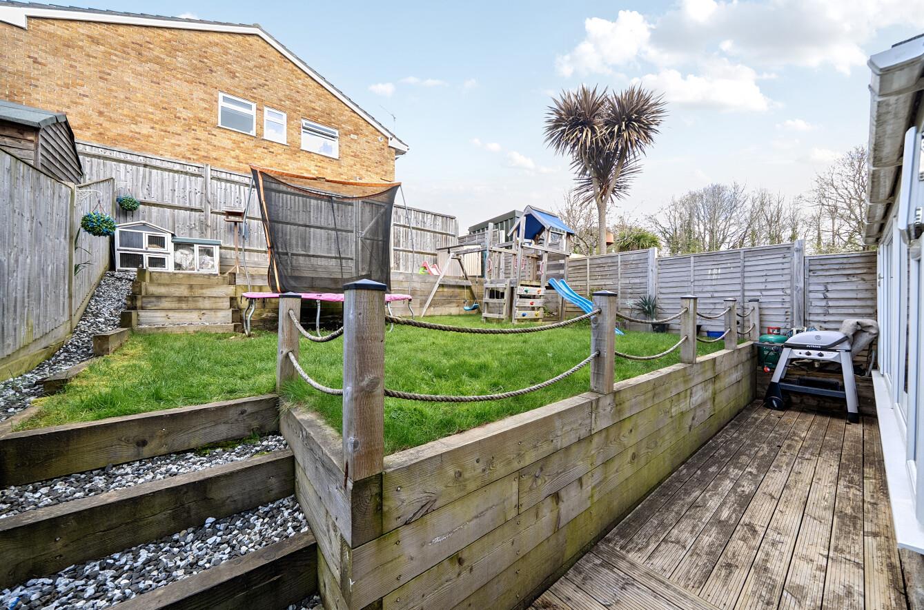 Rear: - Landscaped garden with decking area, steps onto lawn area and further steps to rear access.