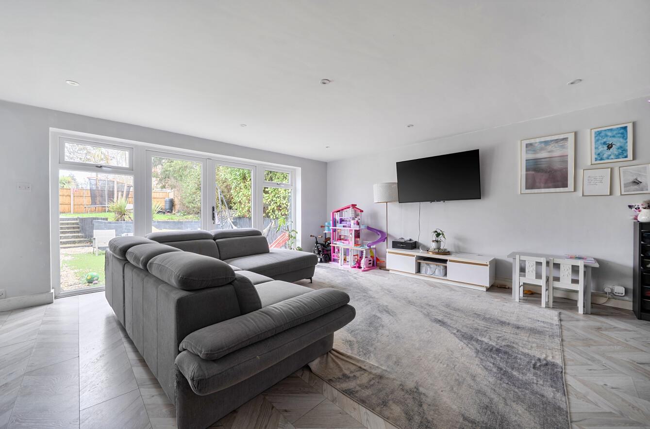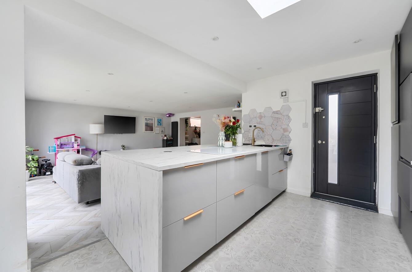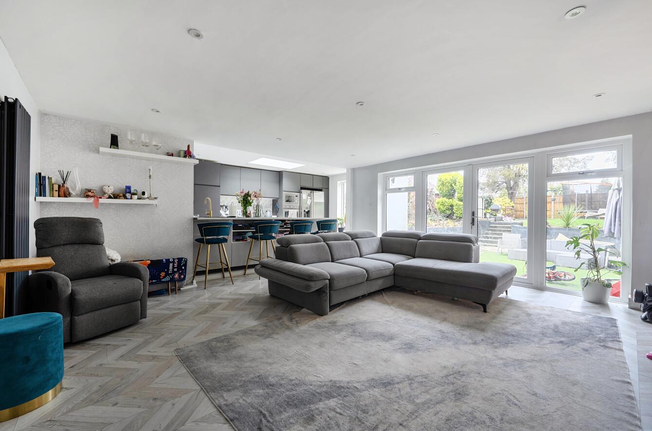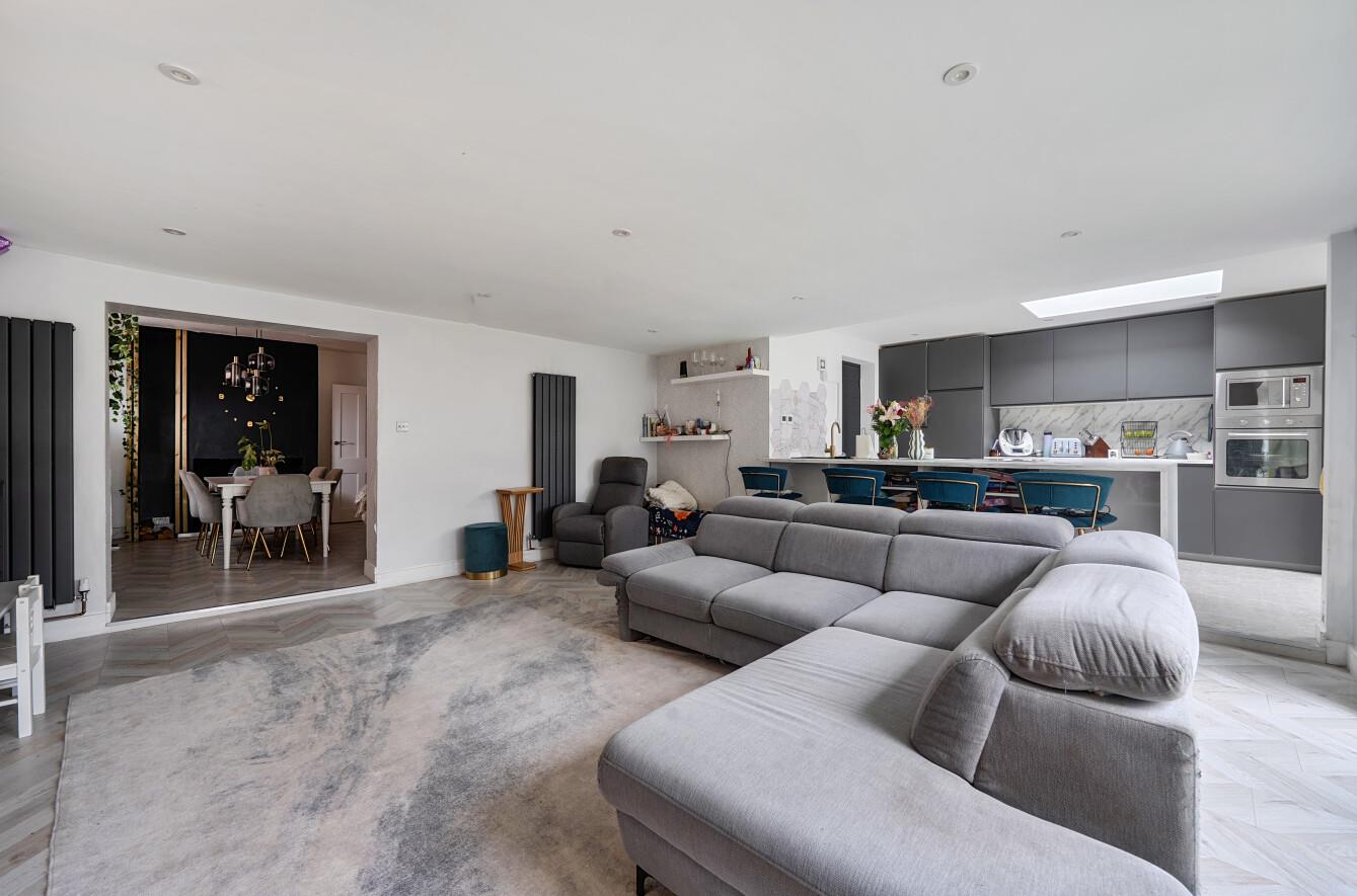 Kitchen/Dining/Family Room - Family Room: 16'10" x 16'10" (5.14m x 5.13m) Kitchen area: 15'11" x 9'10" (4.84m x 3.00m) Modern kitchen with a range of units, integrated sink and dishwasher, fitted double fridge, breakfast bar and access to the side of the property. Large sitting/dining space with double doors leading into the rear garden. Underfloor heating throughout.