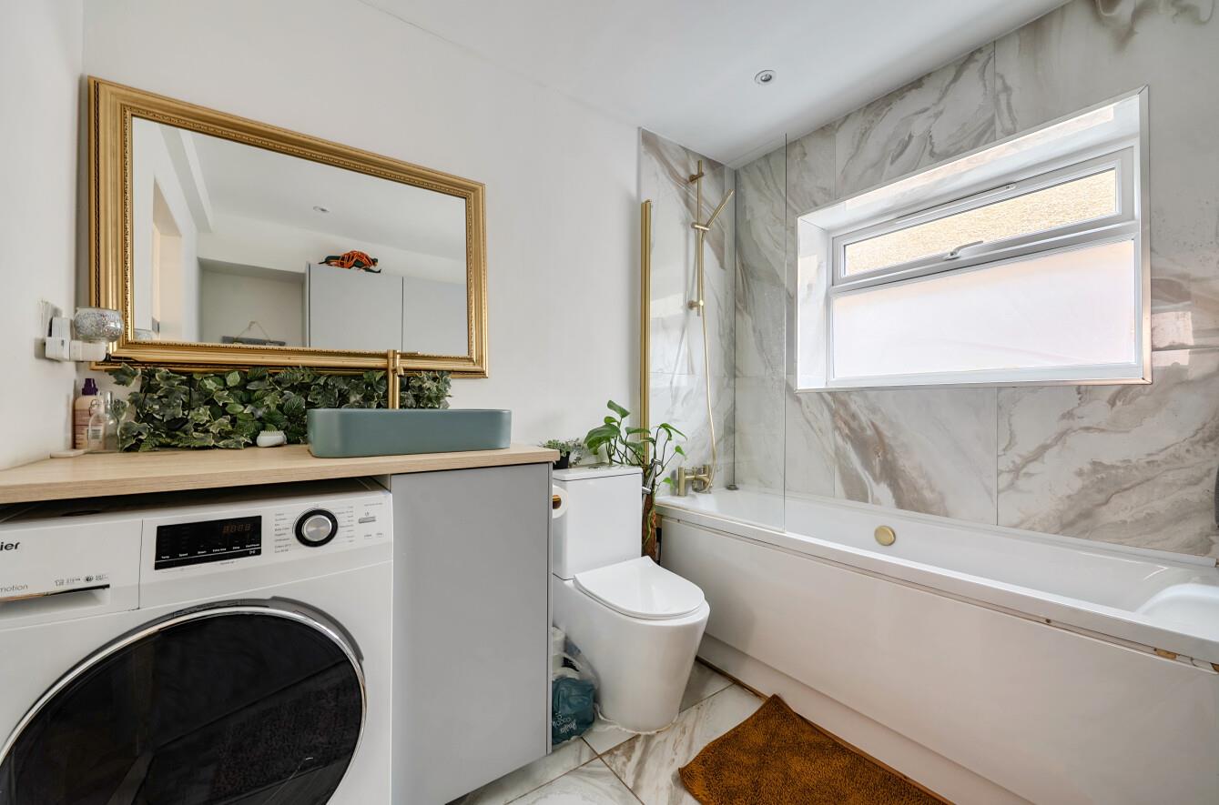 Bathroom/Utility - Modern suite comprising wash basin, WC, bath with shower overhead, and extractor fan. Range of units encasing utilities.