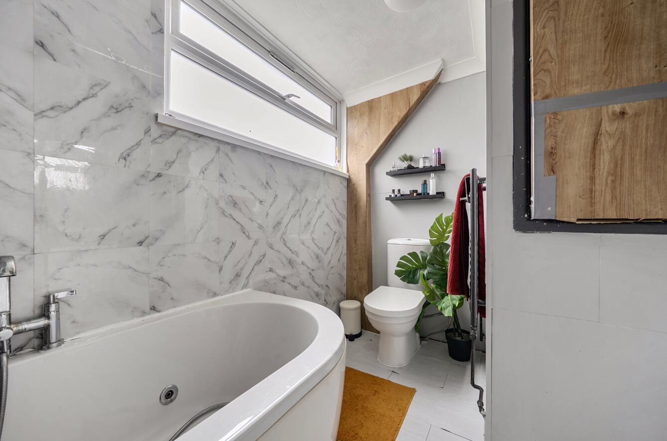 Bathroom: - Wash basin with cupboard under, WC bath, extractor fan and cupboard housing boiler.