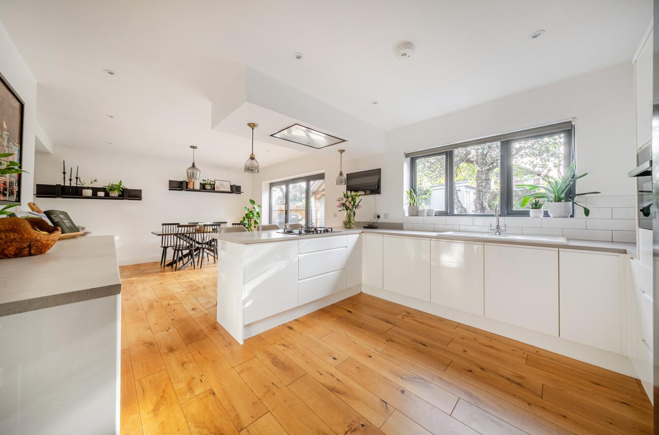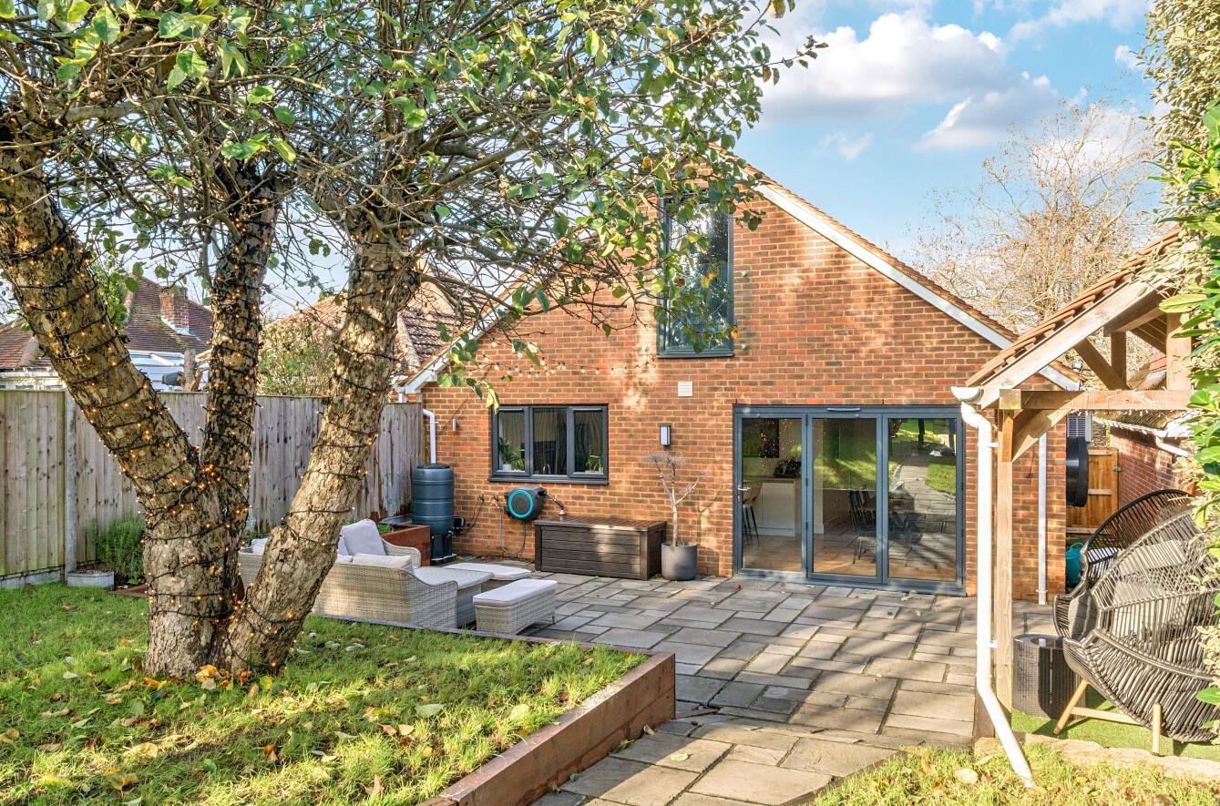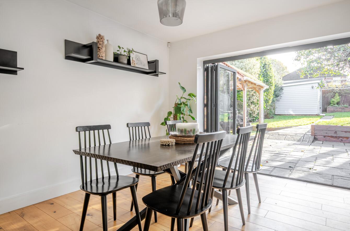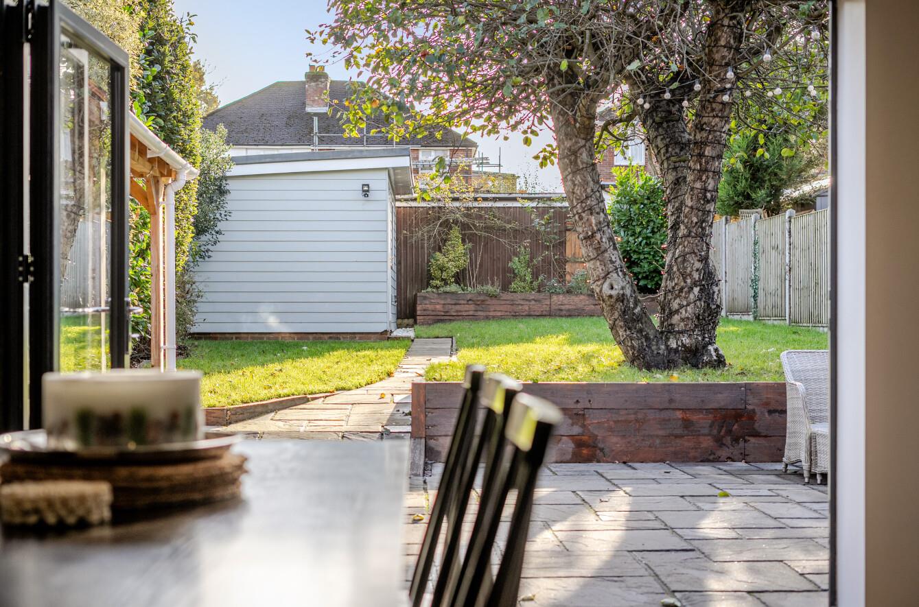 This stunning, well laid out three-bedroom chalet on Leigh Road offers flexible living space across two floors. The ground floor features two comfortable, double bedrooms, a modern bathroom, and a beautifully finished, open-plan kitchen/diner/family room that forms the heart of the home ideal for everyday living and entertaining. Upstairs, the master bedroom occupies the entire first floor, complete with its own shower room and a generous dressing room. Outside, the property benefits from a driveway with space for 2-3 cars, along with a large, landscaped south-facing garden that enjoys plenty of sunshine throughout the day. The rear garden also boasts a pergola offering shaded seating and a home office with electric connected at the end of the garden. The current owners have maintained and added to this home with many updates being made in 2024 including upgraded underfloor heating, a new gas boiler and a water softner.