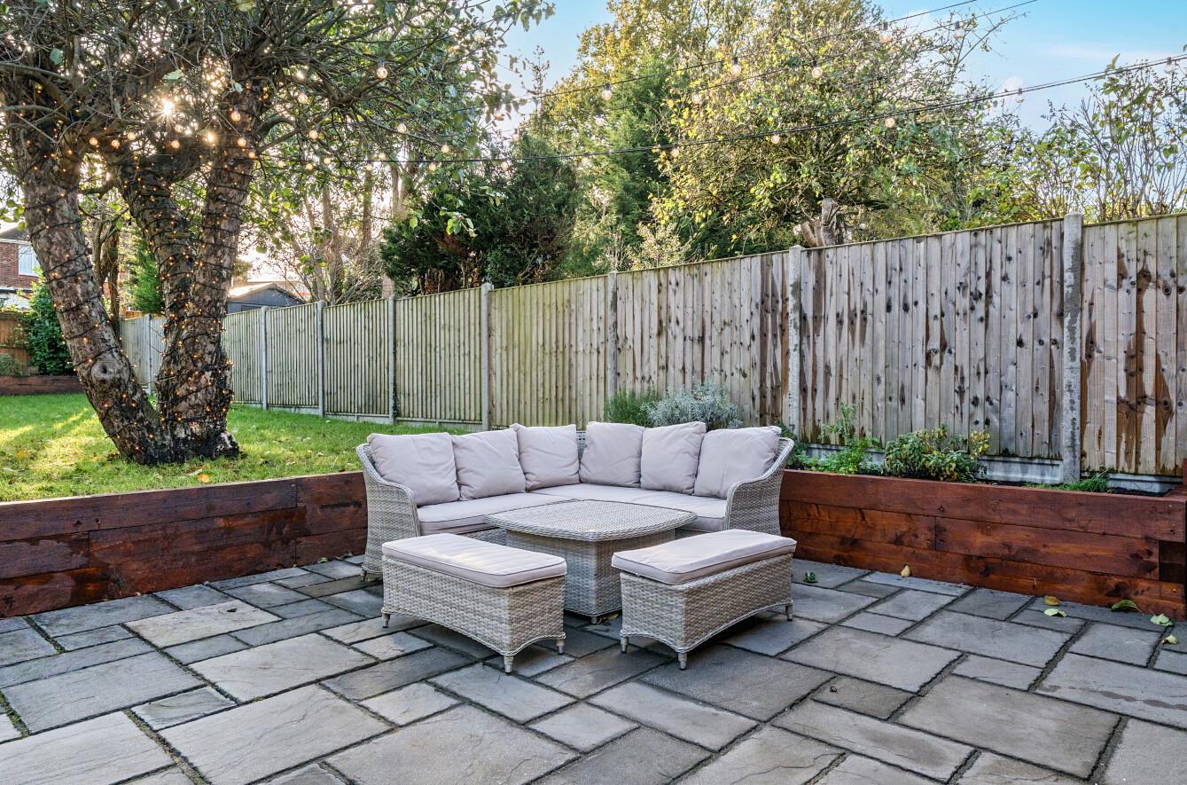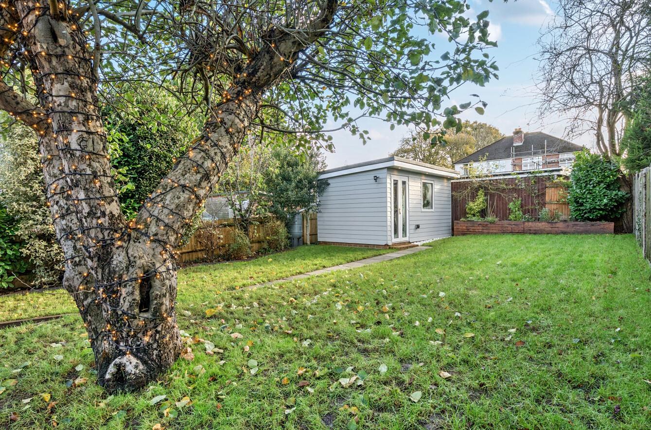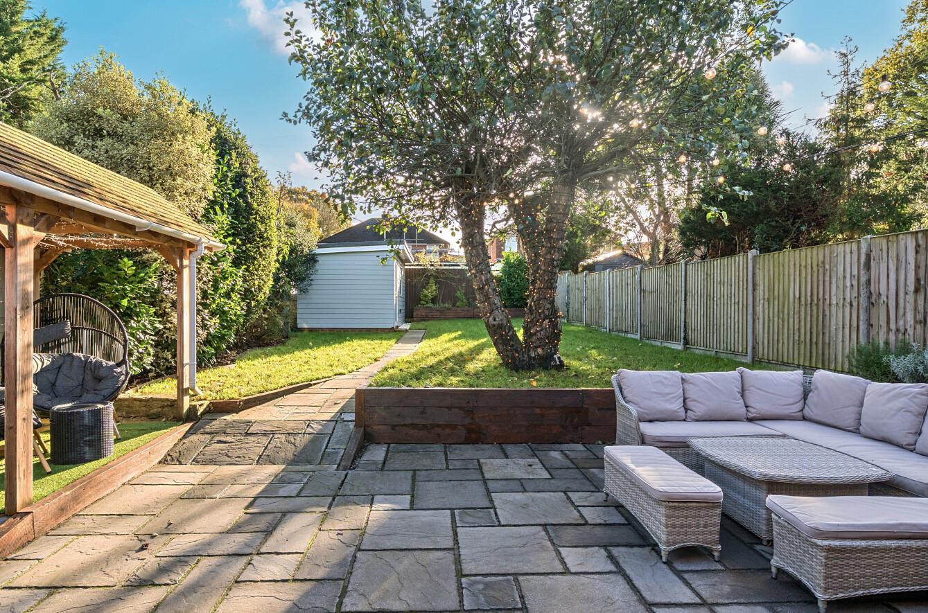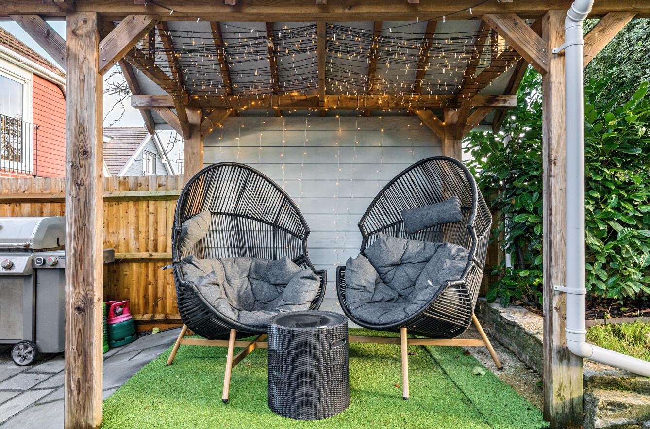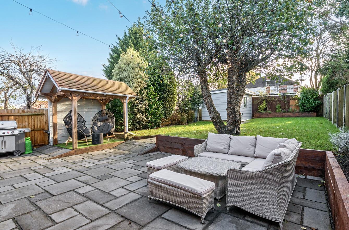 Rear Garden: - South facing rear garden with patio area, pergola seating area, pathway leading to home office and grass area laid to lawn.
