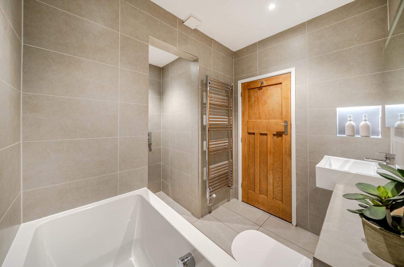 Bathroom: - WC, bath, walk in shower and wash basin with storage space under.