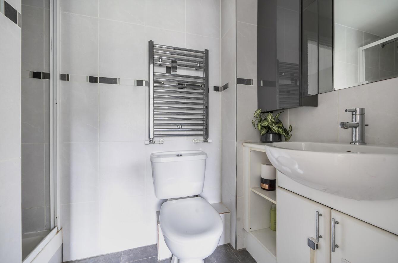 En-Suite: - White suite with chrome fitments comprising shower in cubicle, wash hand basin, w.c.