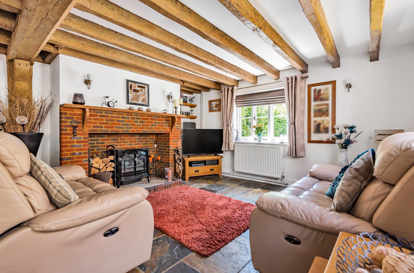 Sitting/Dining Room: - 20'11"×13'8" (6.38m x 4.17m) Feature brick built fireplace surround and tiled hearth with electric fire, tiled floor, under stairs storage cupboard.