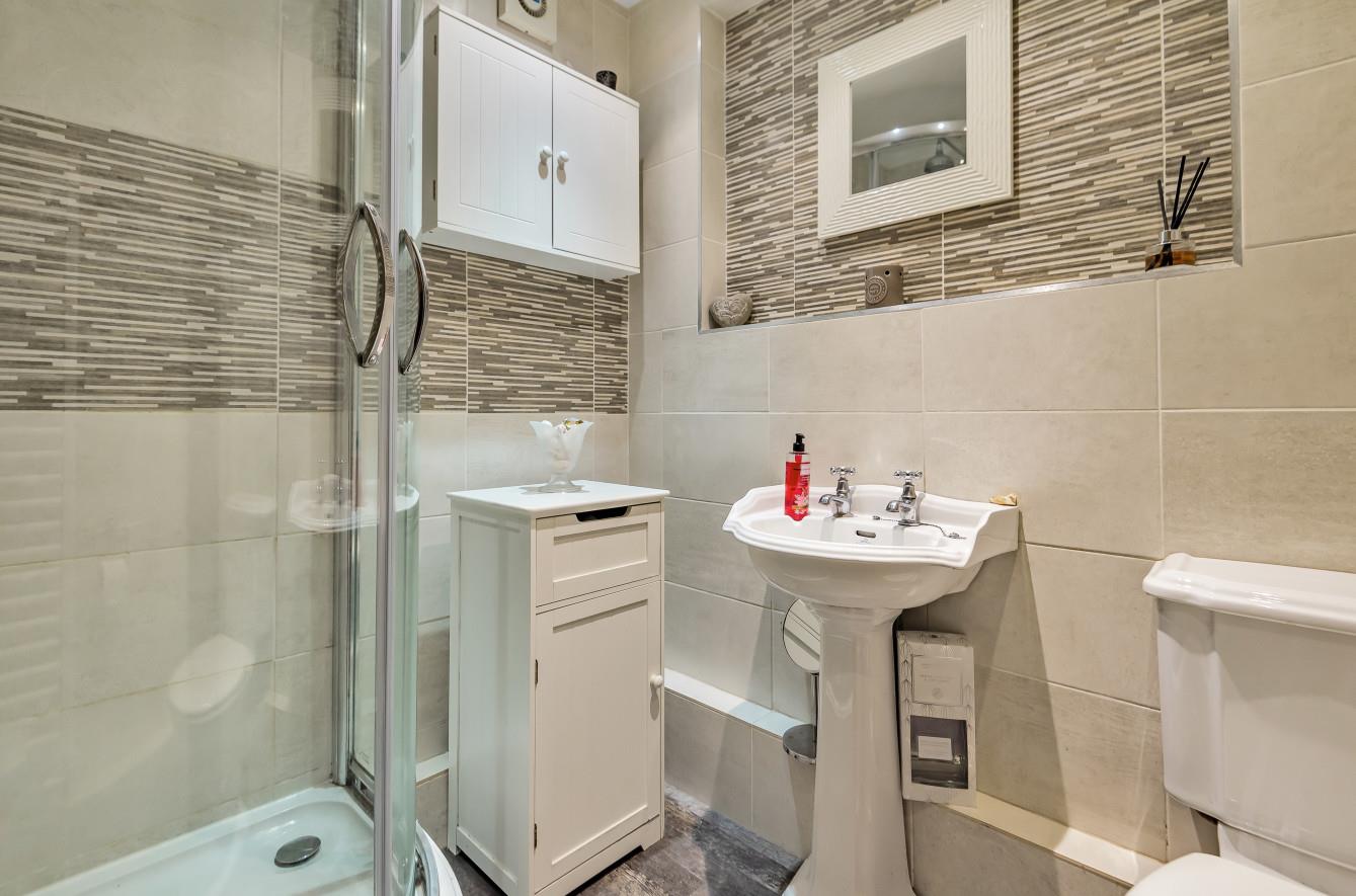 Shower Room: - 6'2" x 5'6" (1.88m x 1.68m) White suite with chrome fitments comprising shower in cubicle, wash hand basin, WC, tiled floor, tiled walls.