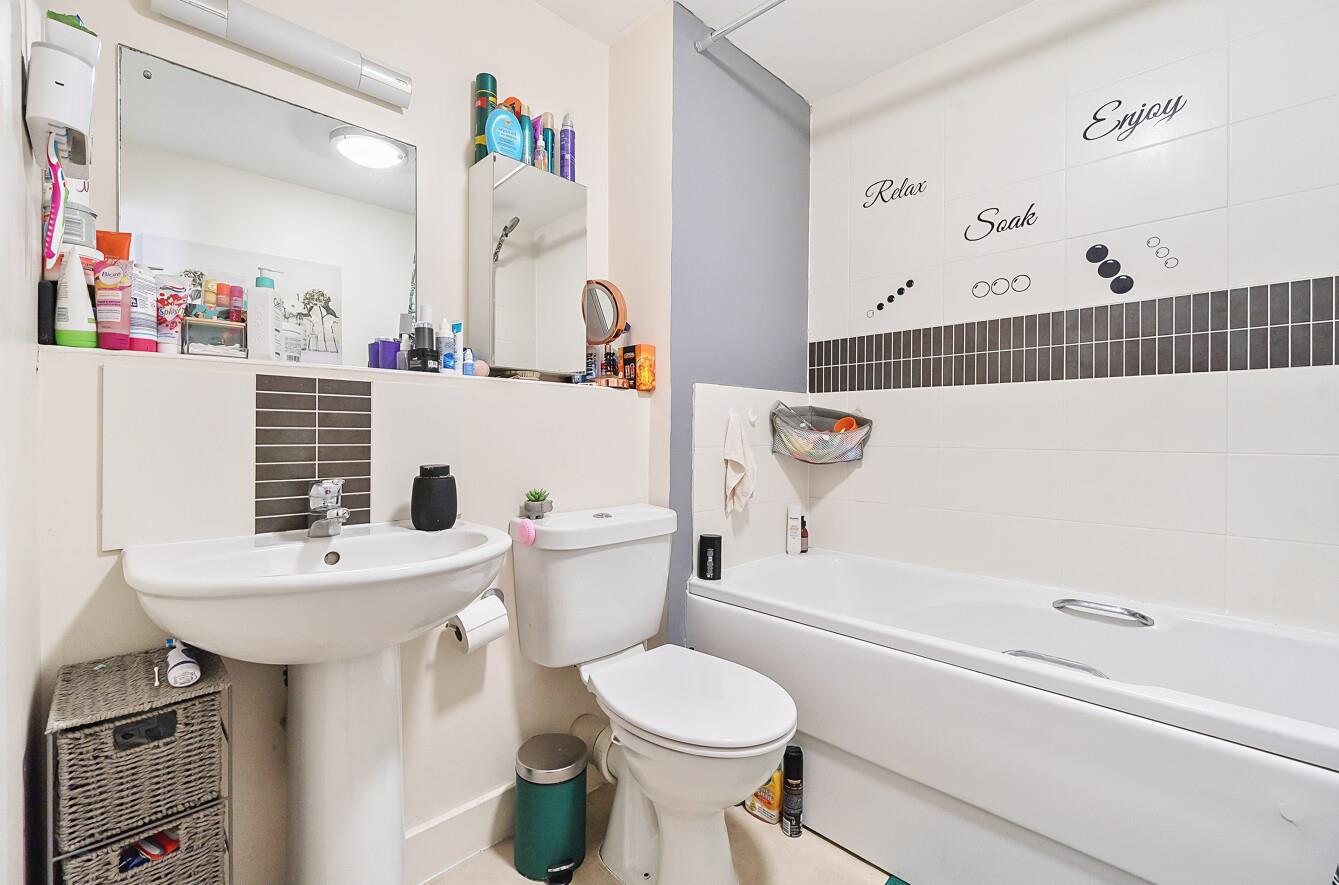 Bathroom: - 6'8" x 6'5" (2.03m x 1.96m) White suite with chrome fitments comprising bath with shower attachment, wash hand basin, WC.