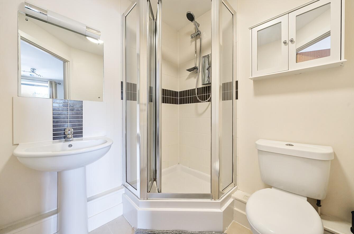 En-Suite Shower Room: - 5'8" x 5'8" (1.73m x 1.73m) White suite with chrome fitments comprising shower in cubicle, wash hand basin, WC.