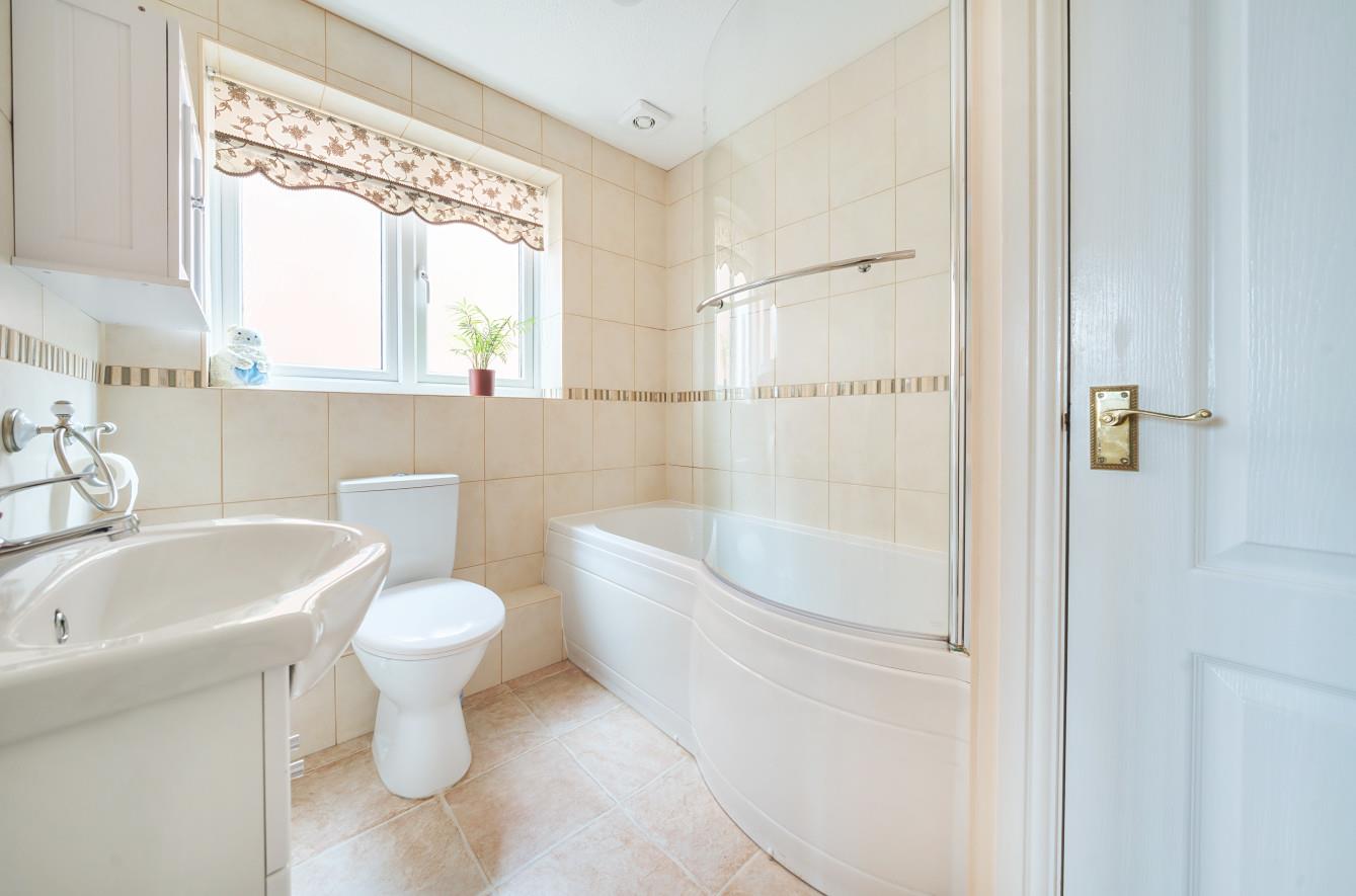 Bathroom: - 2.44m x 1.93m (8' x 6'4") - 8' x 6'4" (2.44m x 1.93m) White suite with chrome fitments comprising P shaped bath with mixer tap and shower attachment and glazed screen, wash basin with cupboard under, w.c., tiled walls, airing cupboard.