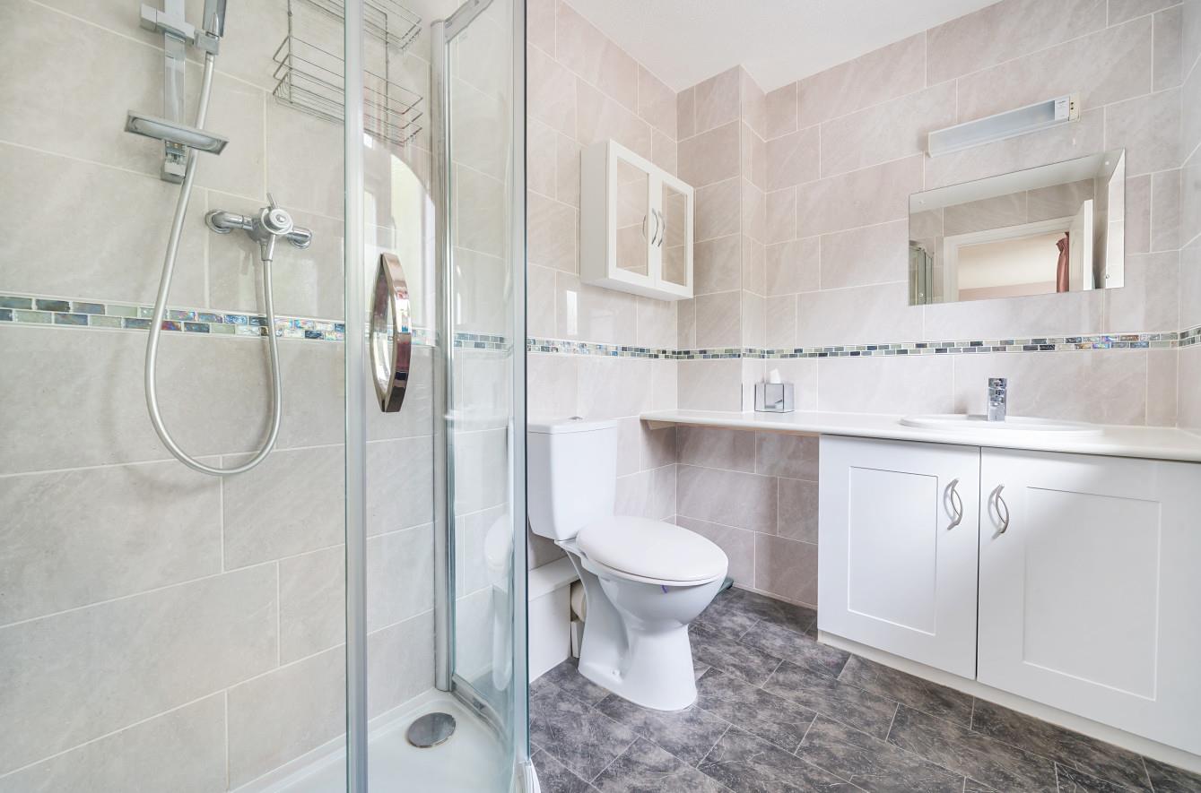 En-Suite Shower Room: - 2.44m x 1.65m (8' x 5'5") - 8' x 5'5" (2.44m x 1.65m) White suite with chrome fitments comprising corner shower cubicle with glazed screen, wash basin with cupboard under, w.c, tiled walls and floor.