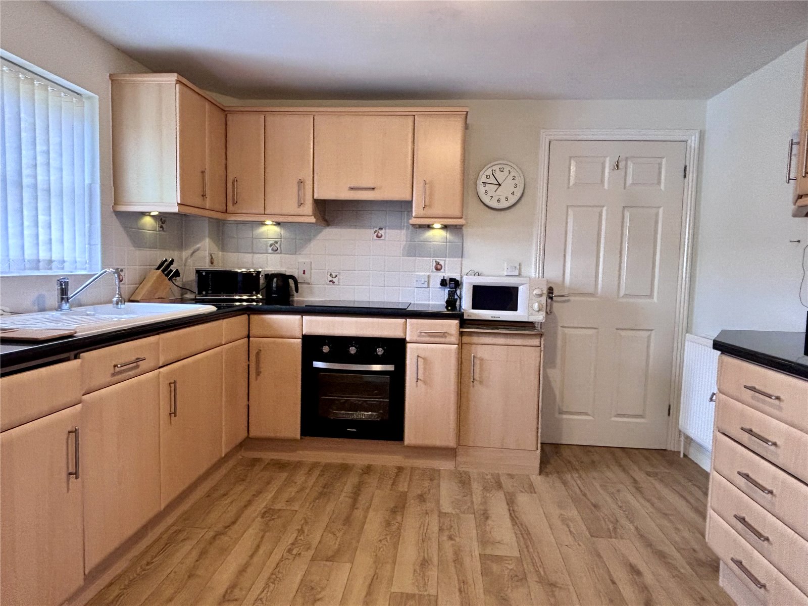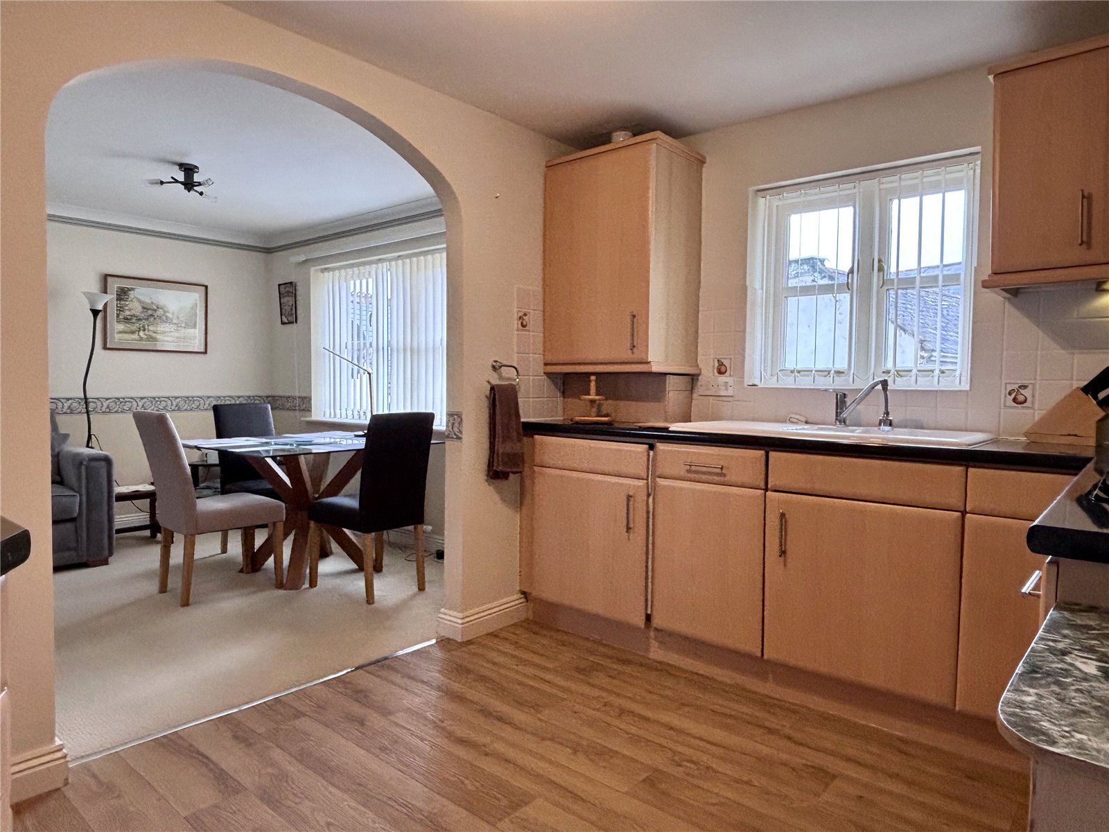 Kitchen 10'10" x 8'10" (3.3m x 2.7m). Rear aspect double glazed window, a range of base and wall mounted units with roll edge work top and tiled splash back, inset 1? bowl ceramic sink with mixer tap, integrated appliances include Montpellier oven with 4 ring induction hob and extractor hood over, fridge freezer and washer/dryer, radiator. Open arch leading to:
