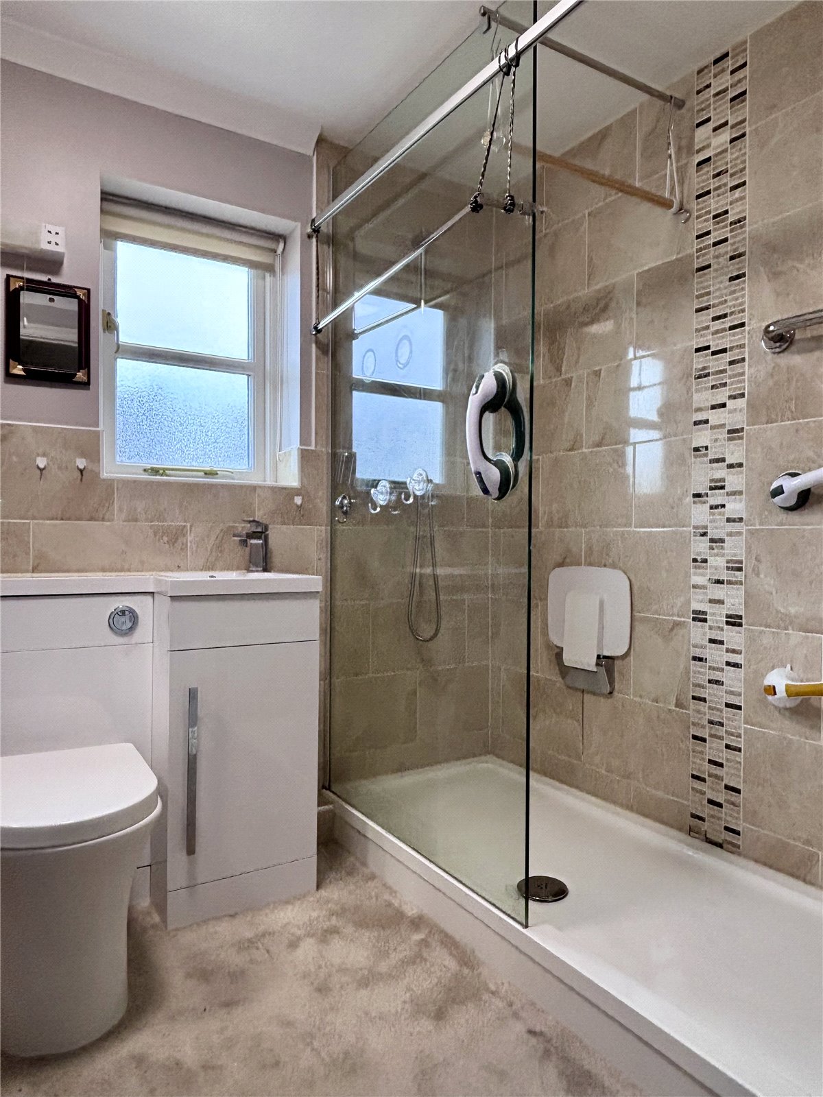 Shower Room 6'6" x 6'1" (1.98m x 1.85m). Rear aspect double glazed window, built in vanity unit with wash hand basin and WC, vanity light with shaver socket, walk in shower with screen and tiled surround, heated towel rail.