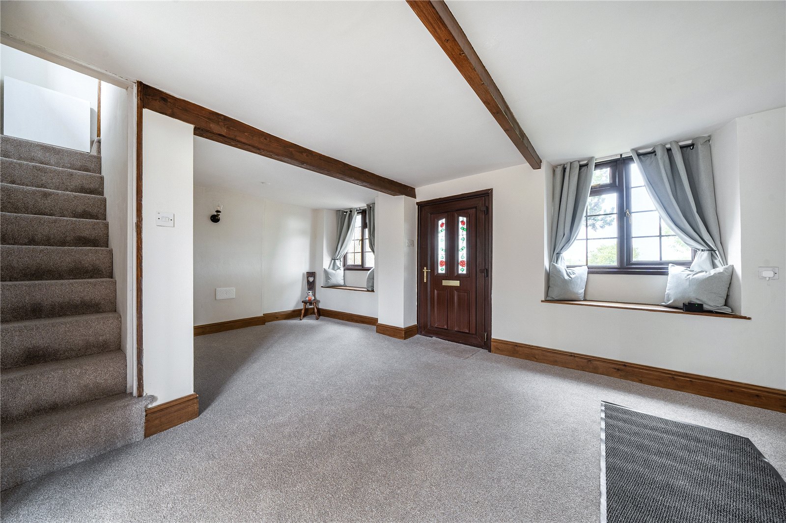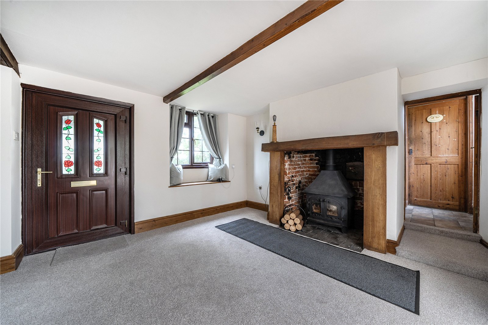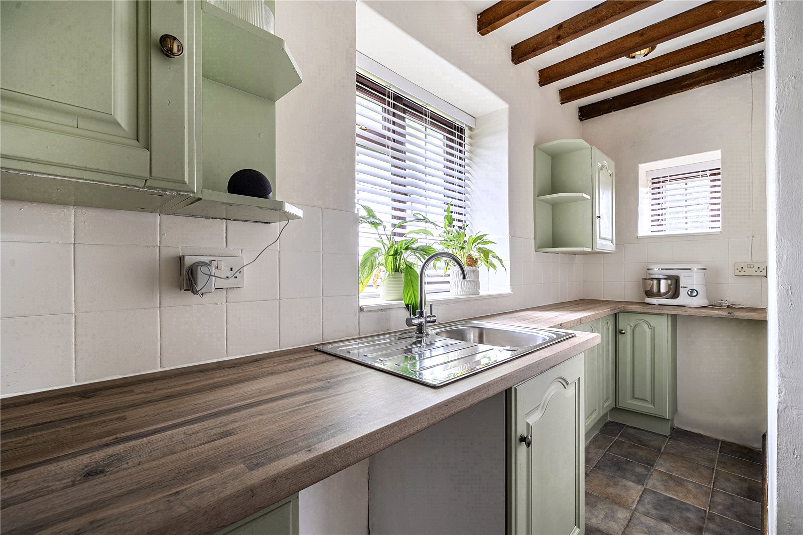 Kitchen 13'7" (4.13m) narrowing to 7' (2.14m) x 5'10" (1.78m) L Shaped. Fitted with a selection of wall and base units with inset sink and drainer. Integrated electric oven with hob and hood over. Space and plumbing for washing machine. Space for fridge freezer. Dual aspect double glazed windows to the front and side. Exposed ceiling beams. Tiled flooring. Tiled splashbacks.