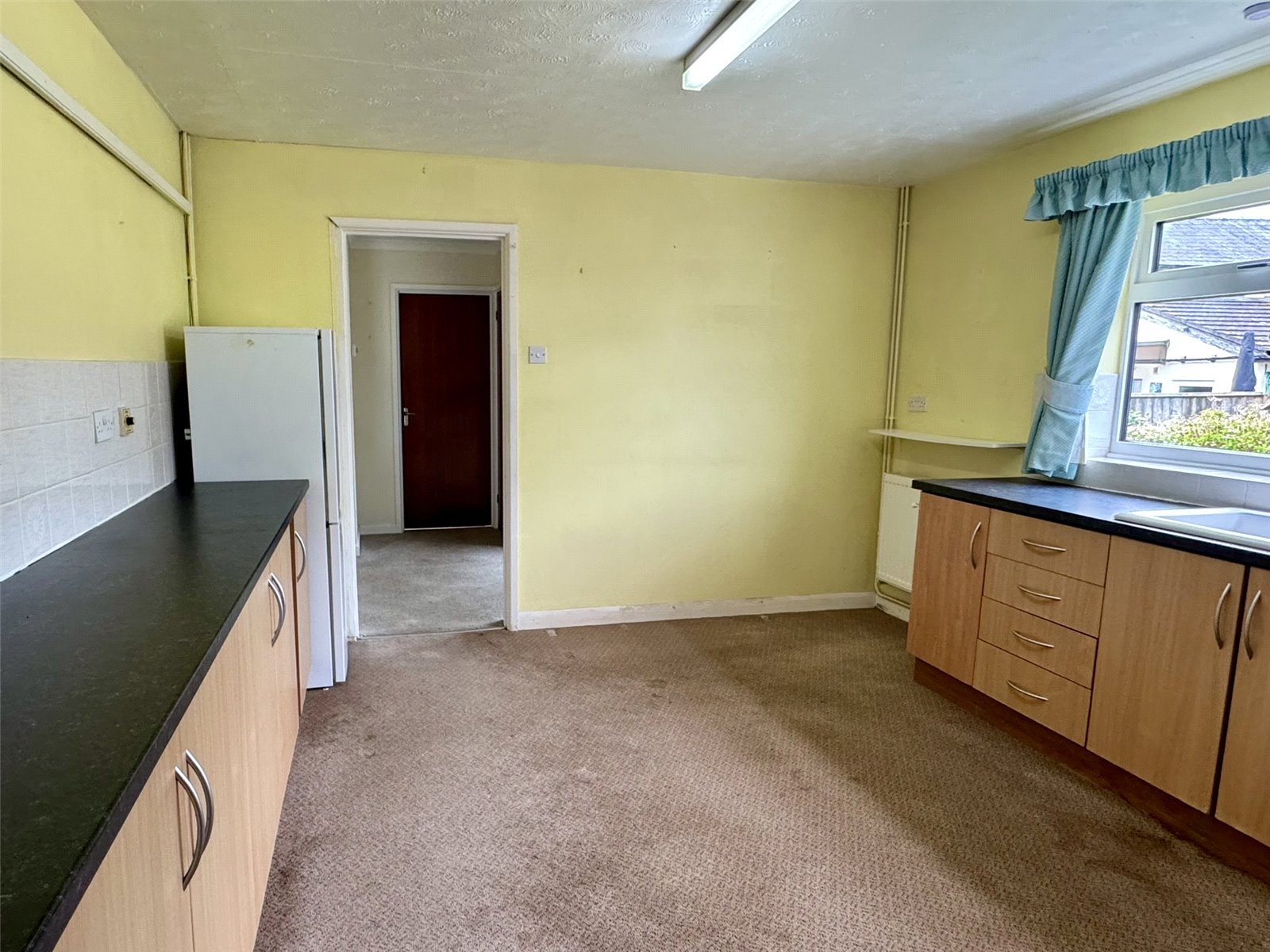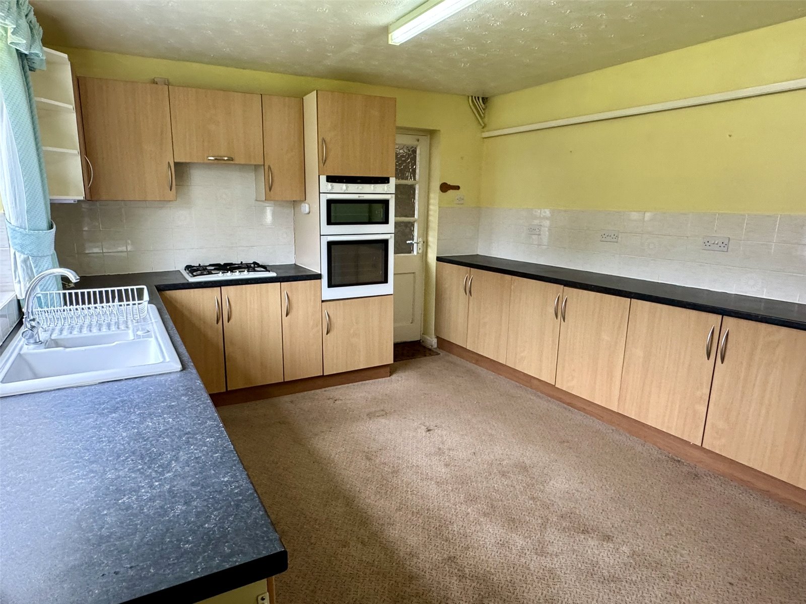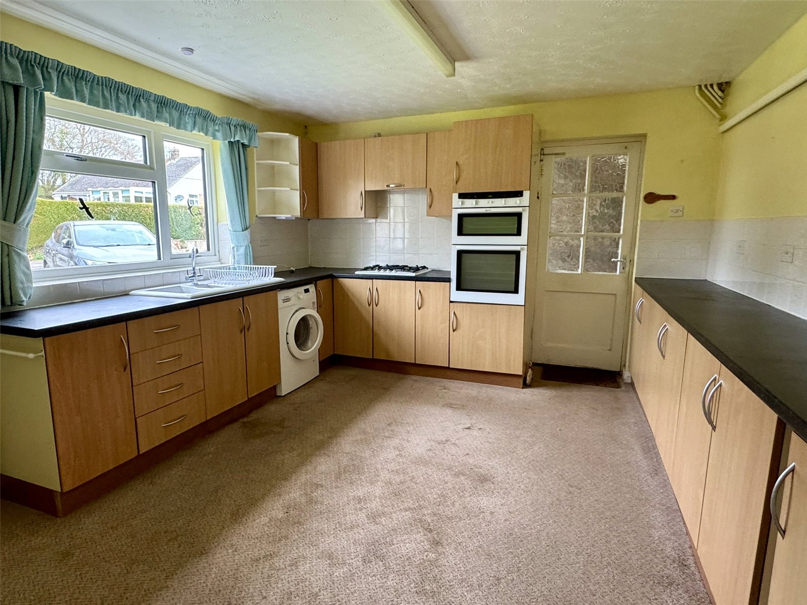 Kitchen 13'10" x 11'11" (4.22m x 3.63m). Fitted with a range of matching wall and base units set beneath worktops with inset sink and drainer. Inset elevated oven and grill, inset four burner gas hob. Space and plumbing for washing machine, space for fridge freezer. Radiator. Double glazed window to the front aspect. Door out to side hall.