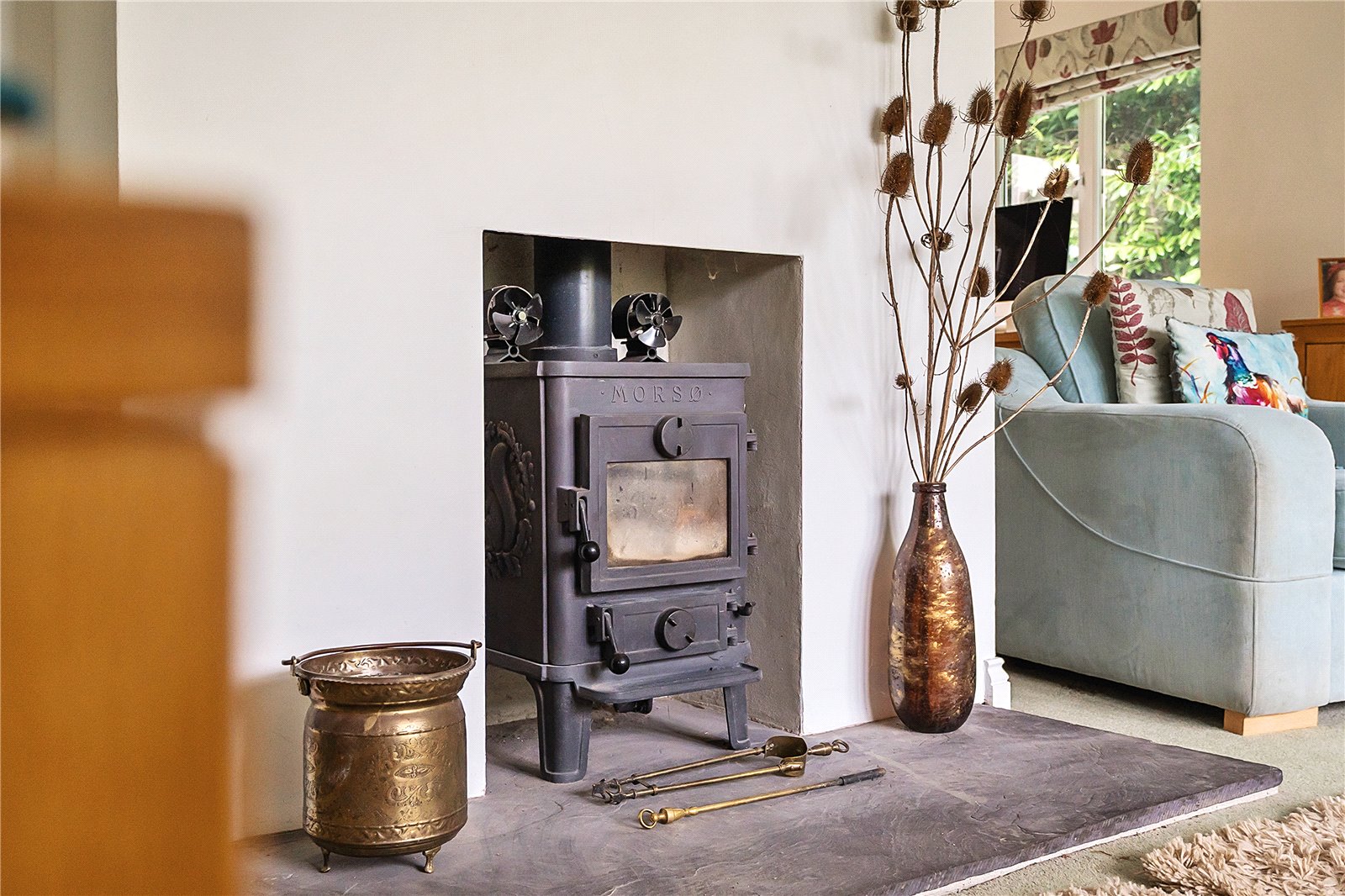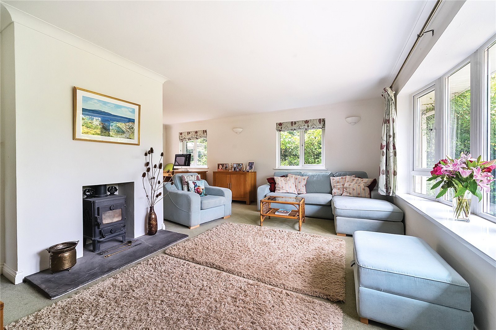 The heart of the home is the spacious triple-aspect L-shaped sitting room, flooded with natural light and centred around a charming wood-burning stove. This inviting living space opens seamlessly into a large conservatory, perfectly positioned to enjoy views over the rear garden and offering an excellent area for entertaining or relaxing throughout the year.