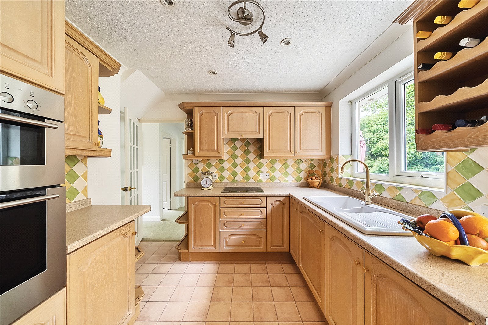 Kitchen 10'5" (3.18m) x 10' (3.06m) narrowing to 8'11" (2.71m). Fitted with a range of matching wall and base units set beneath worktops with inset ceramic one and a half bowl sink and drainer. Inset elevated double oven, inset electric hob and integrated fridge. Radiator, spotlights, double glazed window to the rear aspect. Doors to conservatory and entrance hall.