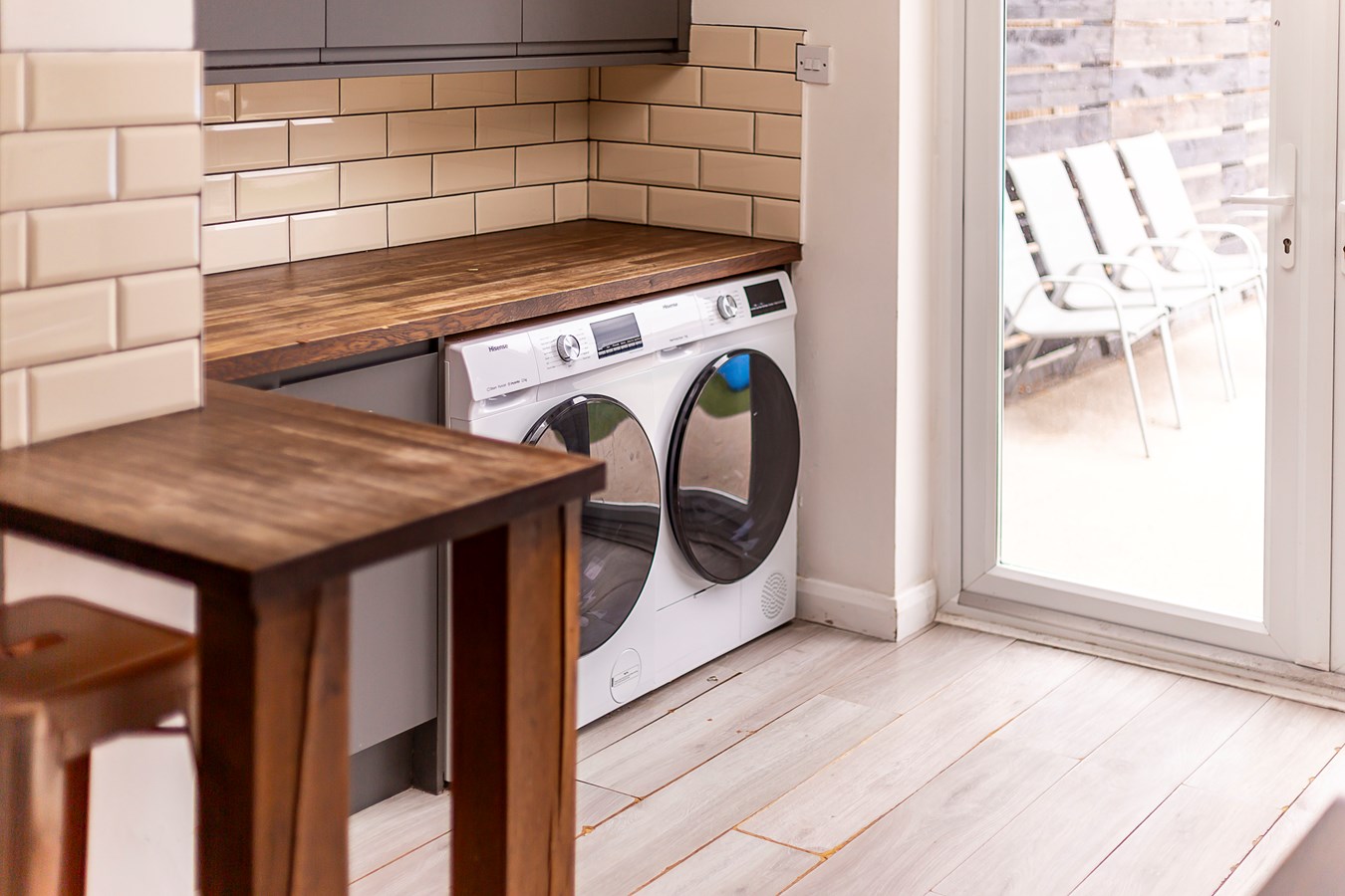 3.00m x 2.13m (9' 10" x 7' 0") Space for laundry appliances, boiler, French door leading to garden.