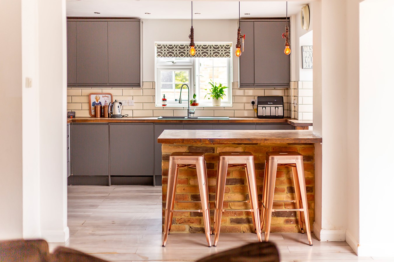 3.71m x 3.00m (12' 2" x 9' 10") Modern kitchen with a range of base and eye units, island and separate utilty area. Solid wood worktops.