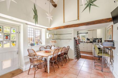 There is ample reception space with four reception rooms as well as an excellent open plan kitchen/dining room with a high vaulted ceiling above. The living room features a magnificent inglenook stone fireplace with a wood-burning stove inset. On the first floor, there are three bedrooms, the principal of which with an en-suite, alongside a further shower room. One of the ground floor reception rooms could be utilised as a fourth bedroom if required.