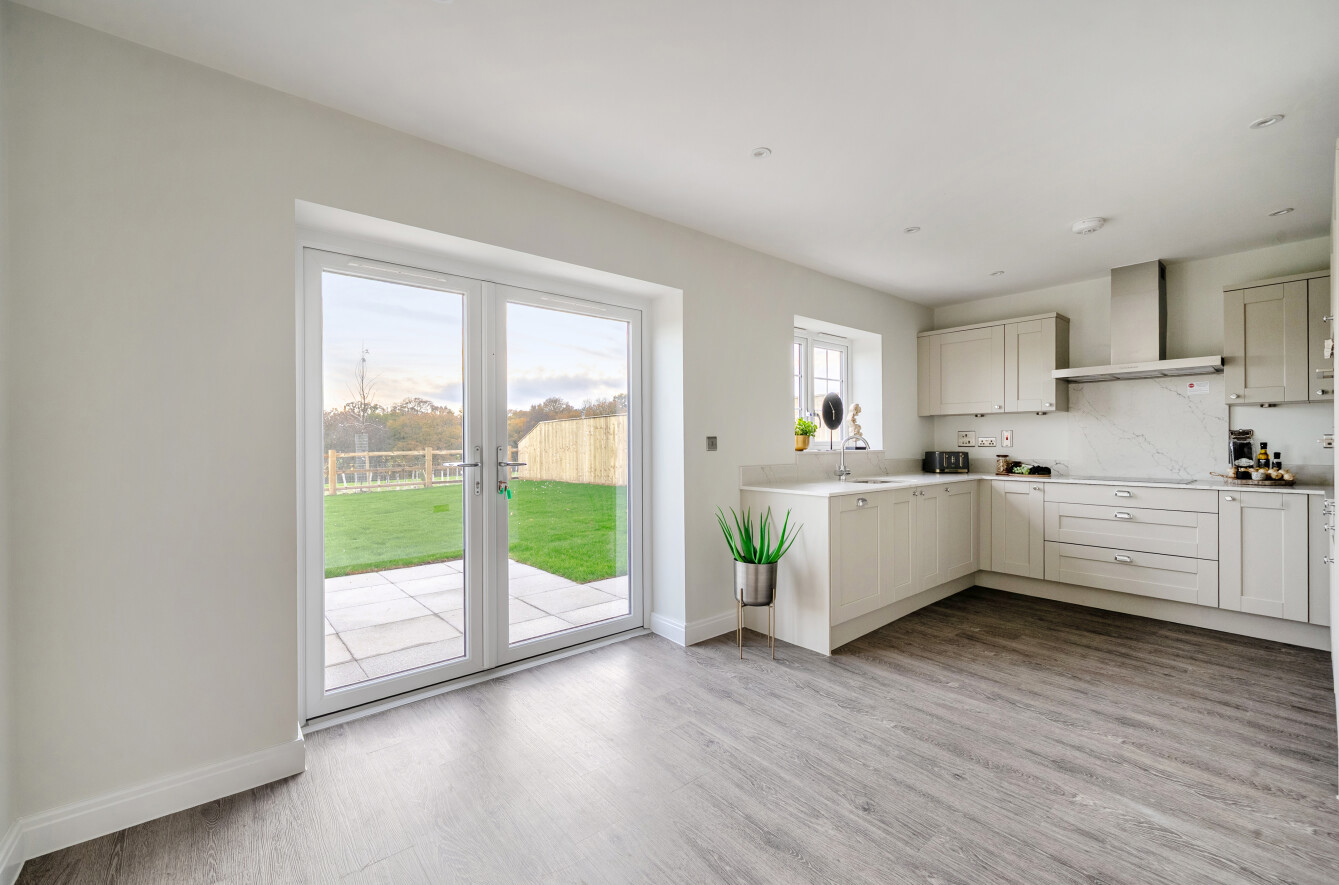 Inside, you'll find two double bedrooms with fitted wardrobes, including a master with en-suite. Off the entrance hall are a family bathroom, storage cupboard, and airing cupboard. At the rear, the south-facing living and kitchen/dining rooms overlook fields and woodland, filling the home with natural light through French doors and additional windows. The kitchen-diner is perfect for entertaining, featuring a shaker-style fitted kitchen with ample storage and integrated appliances.