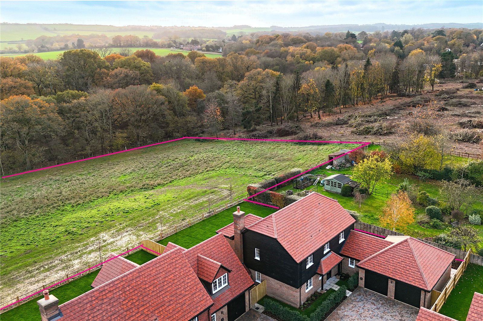 Crafted by T A Fisher, a highly regarded local builder renowned for delivering beautifully finished homes with thoughtful design at their core.Positioned on the southern edge of Bowbrook Copse, this deceptively spacious four-bedroom family home has been carefully planned for modern living, entertaining, and growing families seeking both space and outlook.At the heart of the home is an impressive, fully equipped kitchen with a central island, flowing seamlessly into a generous dining area. Bifold doors at the southern end flood the space with natural light and open onto uninterrupted views across surrounding fields and woodland. A substantial utility room sits conveniently alongside the kitchen, offering direct access to the attached single garagecreating an exceptional and highly functional living environment.Across the entrance hall, which includes a cloakroom and useful understairs storage, is a double-aspect living room featuring a log burner and French doors opening onto the garden. A further versatile room, discreetly positioned near the front entrance, provides an ideal space for home working or flexible use.Upstairs, the sense of space continues. Overlooking the kitchen and garage is a large double bedroom with fitted wardrobes, an en-suite shower room, and characterful dormer windows. Two additional double bedrooms, both with fitted wardrobes, are arranged off the T-shaped landing, alongside a family bathroom and a linen cupboard. Completing the first floor is a further en-suite bedroom at the head of the landing, perfectly suited to an older child or visiting guests.The property is surrounded by gardens and benefits from parking for two vehicles, a single garage, and an EV charging point.In addition, a four-acre+ field is available with the purchase. This land is designated for use as a paddock and is suitable for equestrian purposes. Please note that the field is not available for development and offers no potential for residential or commercial building, ensuring its continued use as open land.For those seeking a peaceful rural setting with expansive views, modern convenience, and generous accommodation, this home represents an exceptional opportunity.Property Size: 185.41 m² / 1,995 ft²EPC (Predicted): B