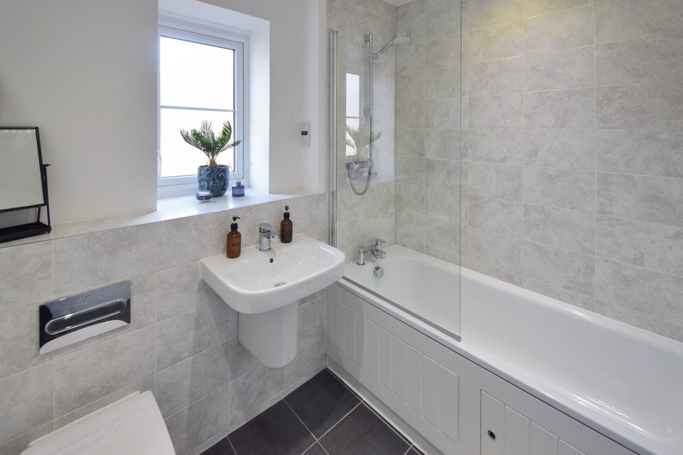Upstairs are three bedrooms, all tastefully decorated, the main bedroom benefitting from a range of built in wardrobes and door to ensuite. The ensuite has a large shower cubicle, WC and wash hand basin. The other two bedrooms are of good proportions, ideal for a growing family or professional couples looking for home office space.