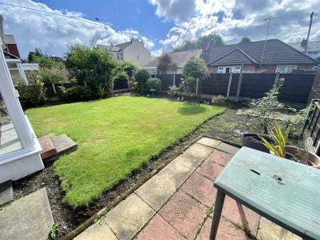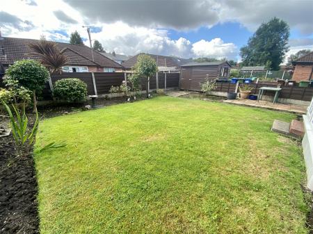 OUTSIDE To the front a stone chip garden area, concrete paved driveway to the side. To the rear a paved patio, timber shed, lawn with boarders, south facing.